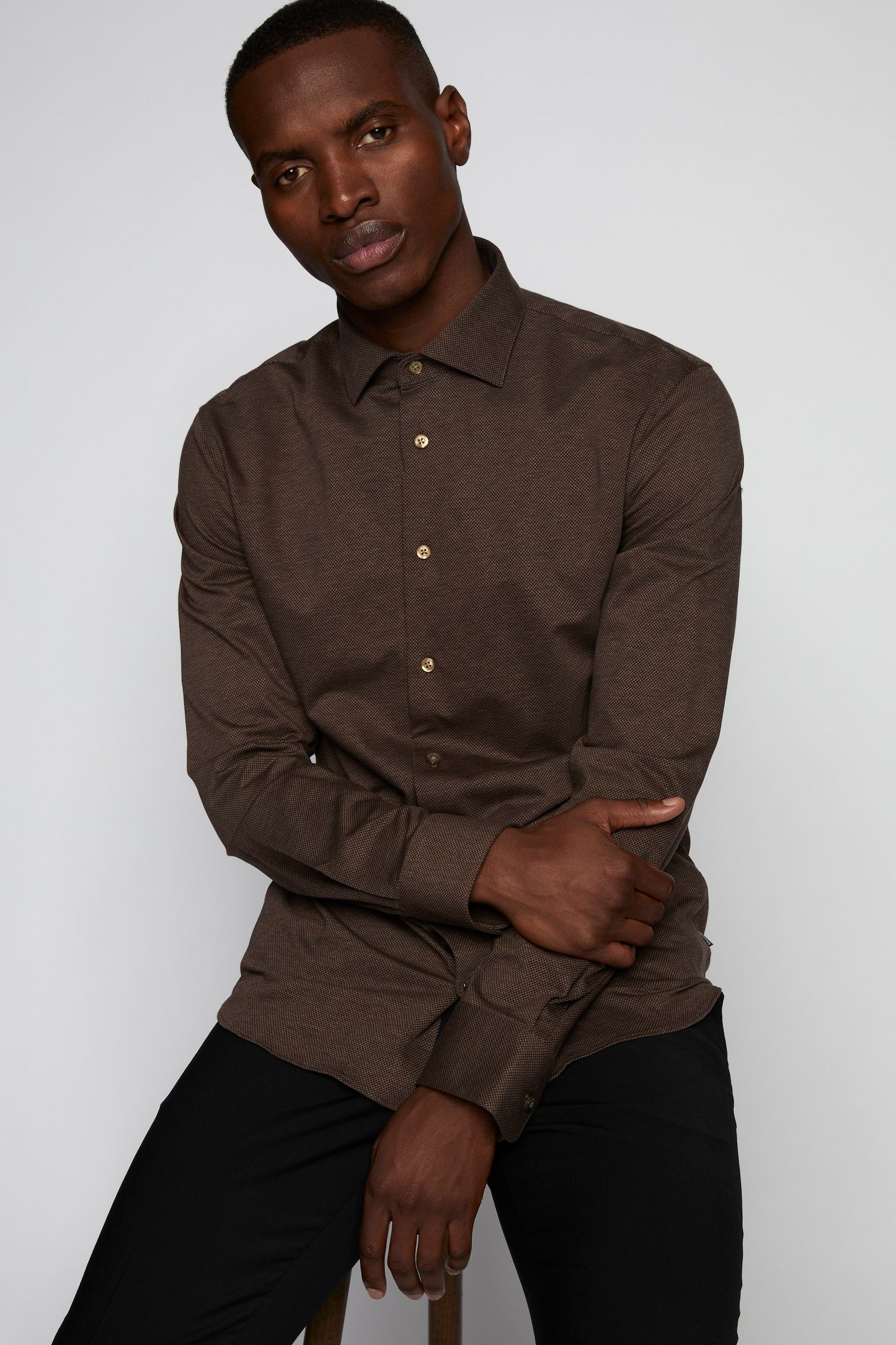 Introducing our stylish shirt with a spread collar and full sleeves, designed for a comfortable regular fit. Its solid brown color adds a touch of sophistication to any outfit. Elevate your wardrobe with this versatile and timeless piece.