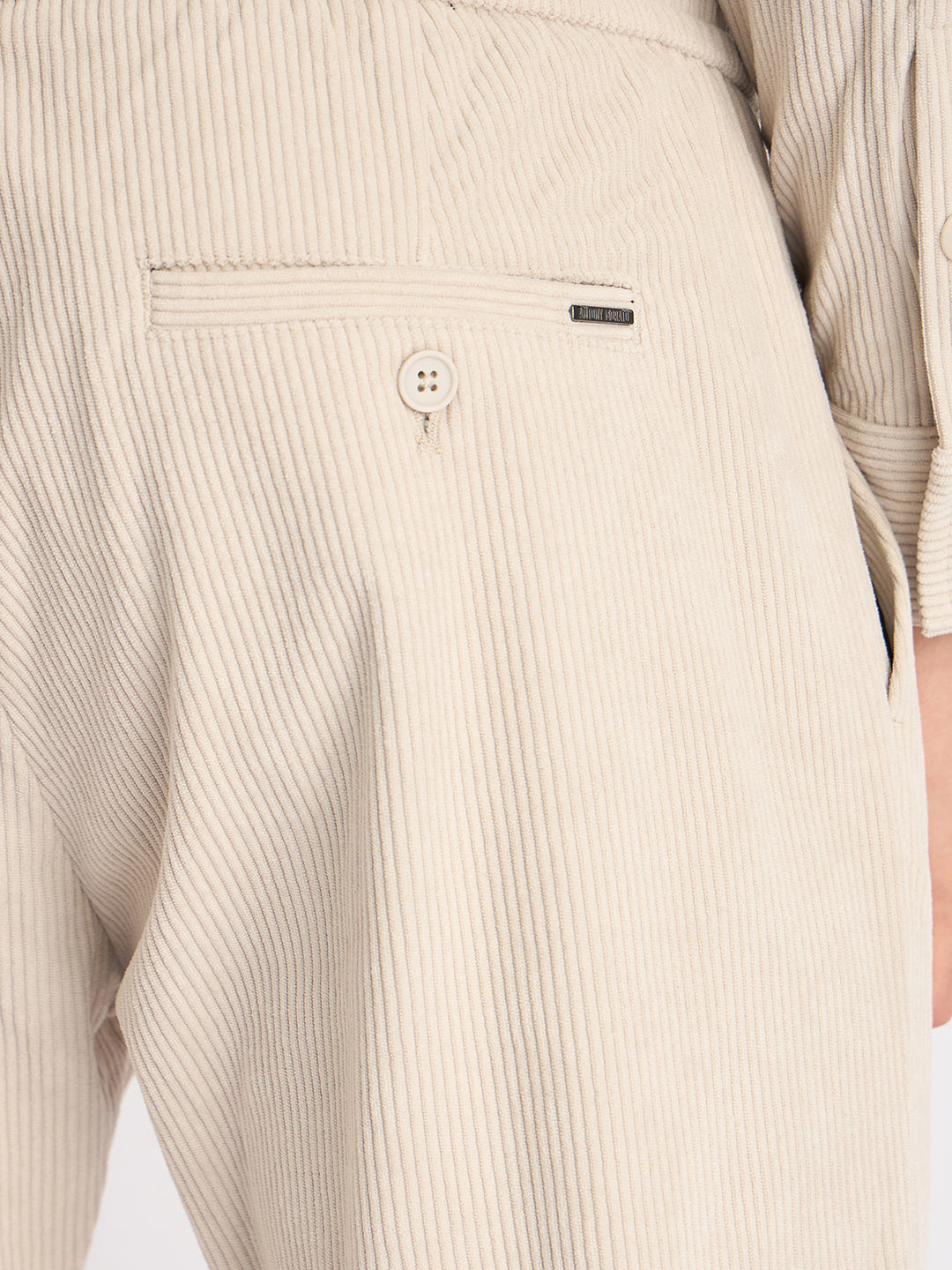 Effortlessly stylish, these beige corduroy trousers offer a slim fit for a contemporary look. Crafted from comfortable polyester, they feature a mid rise, drawstring closure, and a timeless solid pattern. Perfect for casual outings or smart casual occasions.
