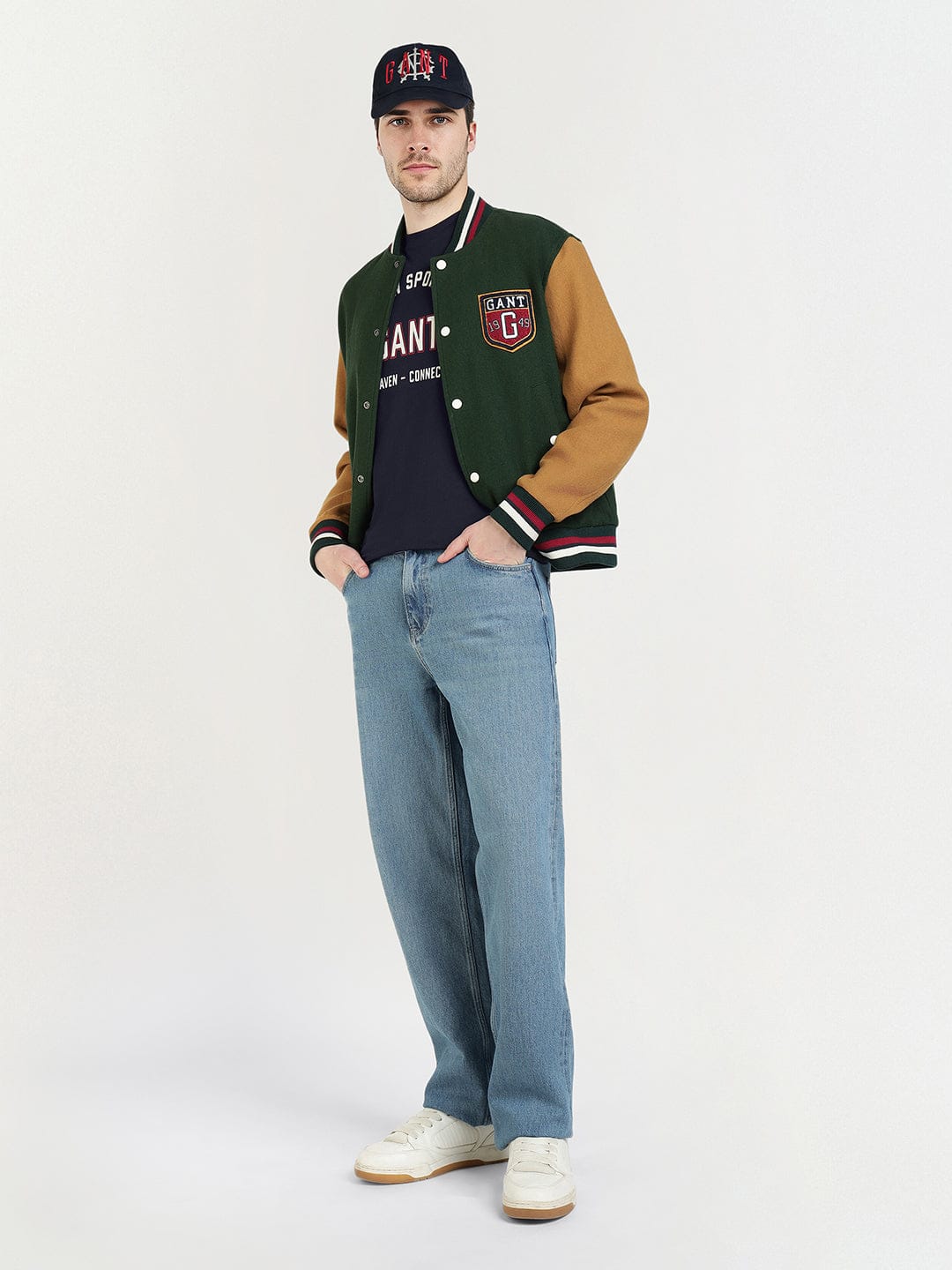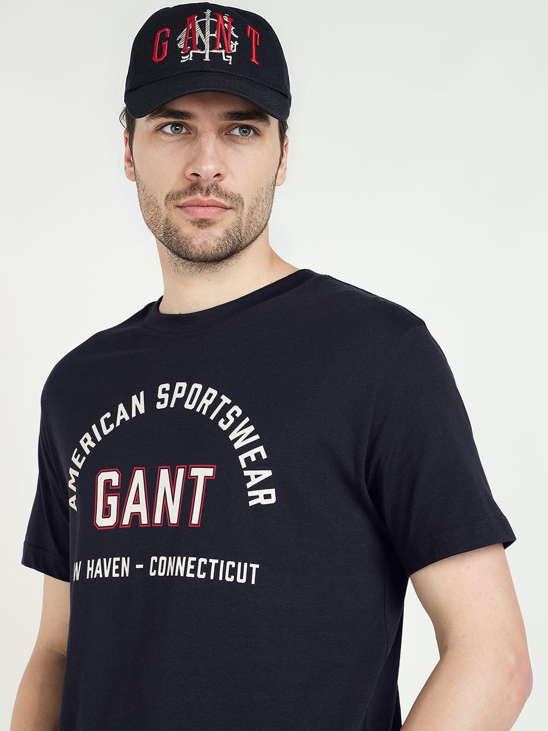Elevate your casual style with the GANT Men's Blue Cotton knitted logo crew neck T-shirt. Crafted from soft, breathable cotton. This short-sleeved pull-over features a classic crew neck design and a regular fit for all-day comfort. The iconic GANT logo adds a touch of sophistication to your look, making it perfect for both lounging at home and running errands. Whether you are pairing it with jeans for a laid-back vibe or layering it under a blazer for a more polished ensemble. This versatile t-shirt is a must-have staple in any man's wardrobe.