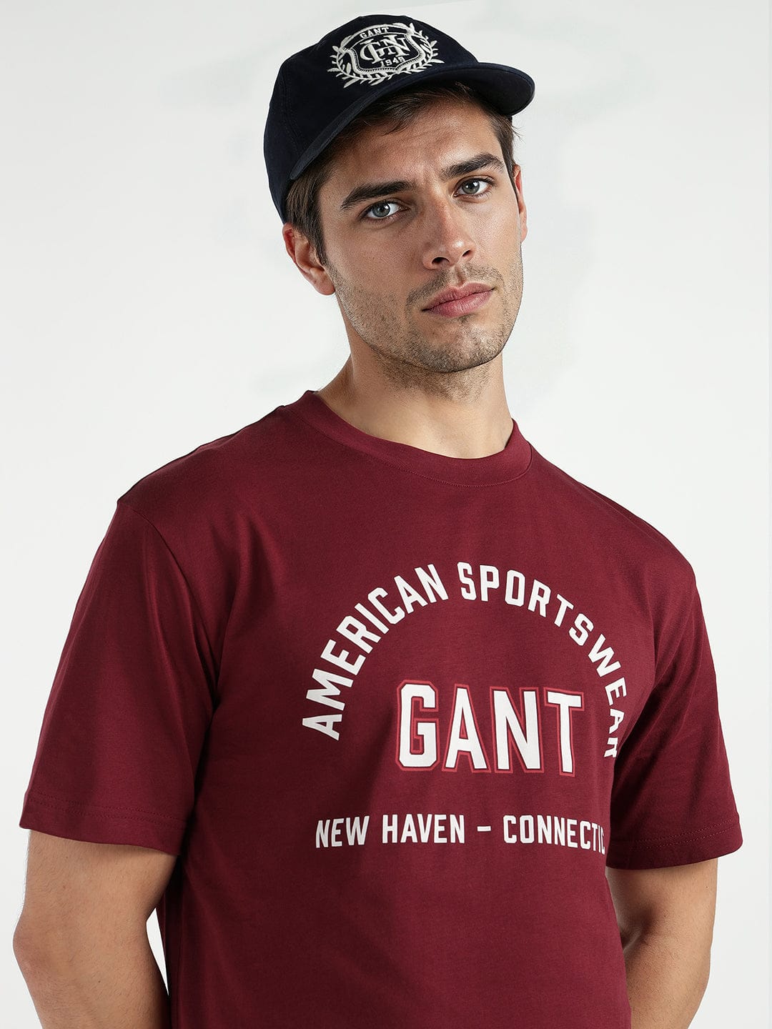 This GANT Men Maroon Cotton knitted logo crew neck T-shirt crafted from premium cotton. This short-sleeve pull-over features a regular fit for all-day comfort. The iconic GANT logo adds a touch of sophistication to your everyday look. Perfect for a relaxed day out or a casual evening with friends. This versatile T-shirt is a must-have for any modern man's wardrobe. Upgrade your style effortlessly with the GANT Men Maroon Cotton knitted logo crew neck T-shirt.
