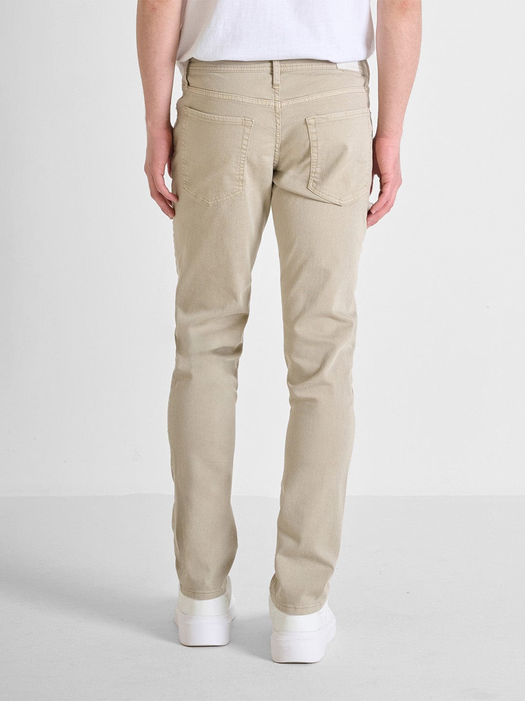 Beige tapered fit jeans for men. These mid rise jeans are crafted from soft cotton for all day comfort. The solid color and tapered fit create a sleek and stylish look. Featuring a button and zipper closure for a secure fit. Perfect for casual outings or a more dressed up occasion.