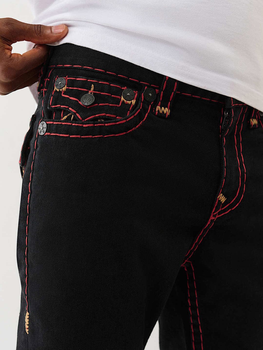 TRUE RELIGION Men Black SUPER T Rocco Slim Fit Jeans is crafted with premium materials and a sleek slim fit design. This jeans offer both style and comfort. The innovative SUPER T stitching adds a touch of luxury, while the timeless black color makes them versatile for any occasion. Whether you are dressing up or keeping it casual. This jeans are sure to be a staple in your wardrobe.