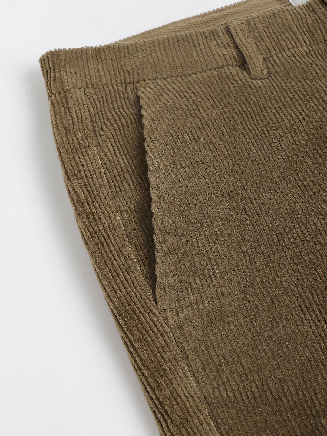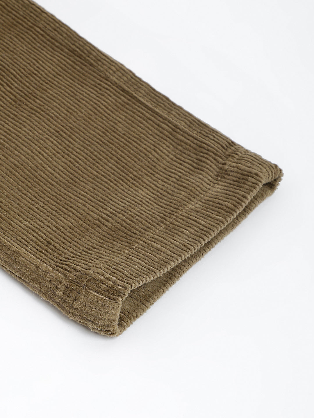 Effortlessly stylish, these khaki flat-front corduroy trousers offer a comfortable regular fit. Crafted from a soft cotton blend, they feature a mid-rise waist, button and zip closure, and a timeless solid pattern. Perfect for casual and smart casual occasions.