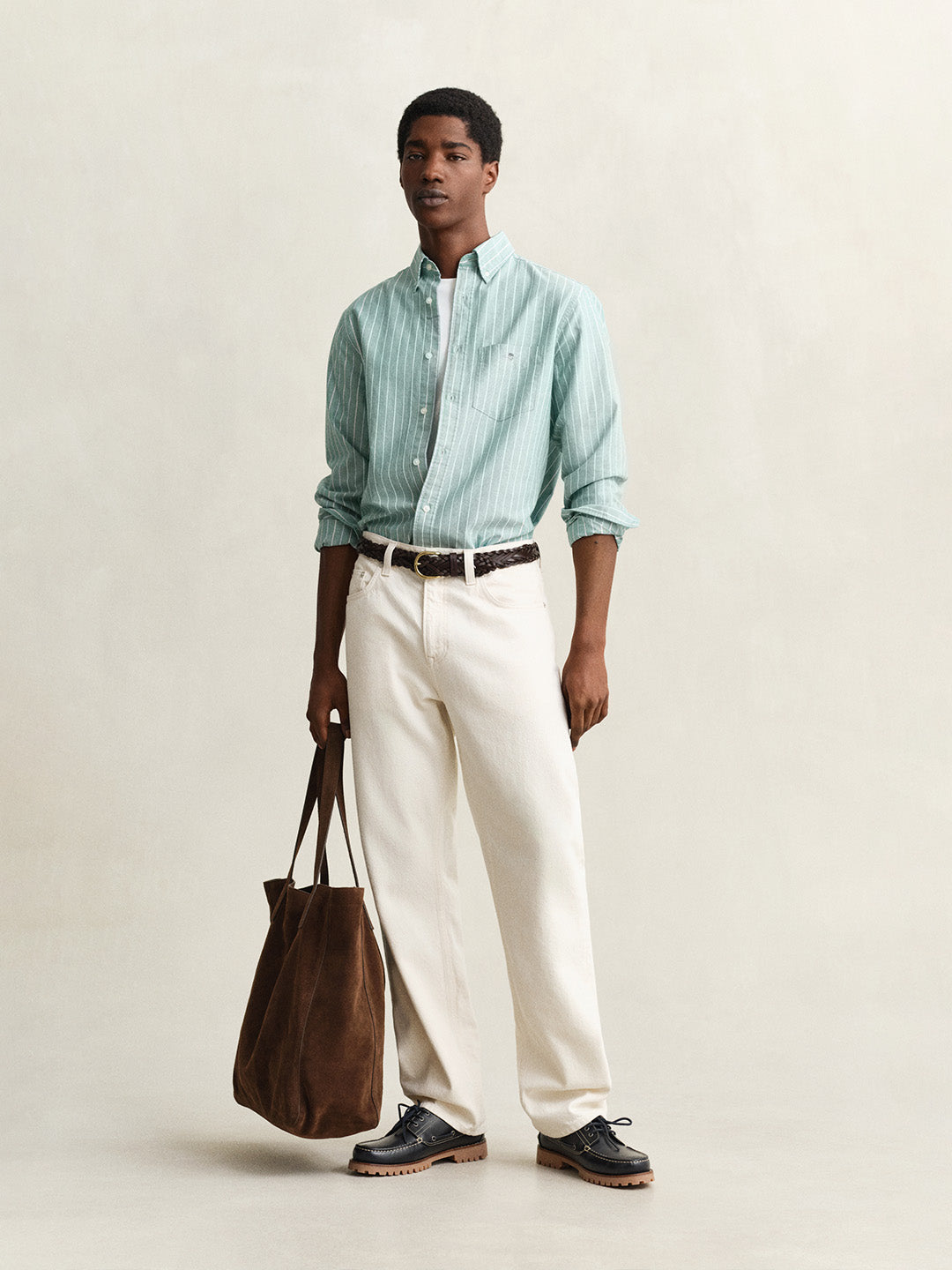 Elevate your wardrobe with our GANT Men Green Striped Regular Fit Classic Oxford Shirt. Crafted from premium materials, this shirt offers a timeless design with a modern twist. The classic oxford style is perfect for any occasion, while the regular fit ensures both style and comfort. The green striped pattern adds a touch of sophistication to your look, making it a versatile piece for your closet. Upgrade your style with this must-have shirt that effortlessly combines quality, comfort, and style.
