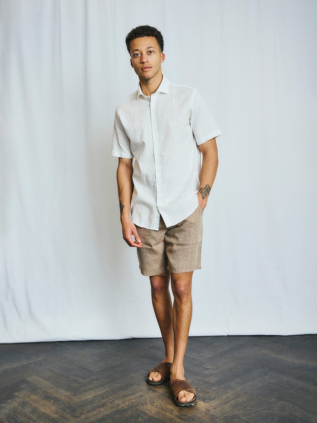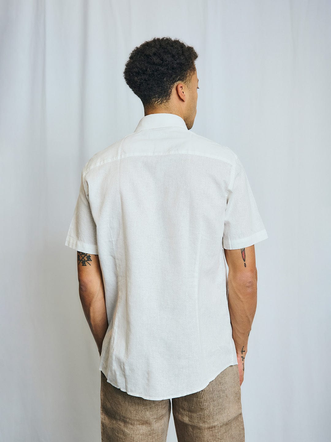 Elevate your wardrobe with this white shirt, featuring a casual modern fit and solid pattern. Crafted from a premium linen blend, it offers breathability and comfort. The short sleeves and spread collar add a touch of sophistication, while the button closure ensures a polished look. Perfect for any occasion.