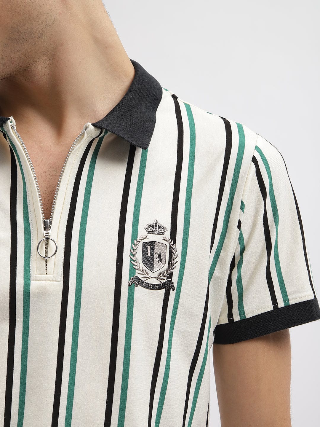 Showcase your style with this multi-colored, regular fit t-shirt for men. Designed with a printed pattern and short sleeves, it features a classic polo collar and a convenient zipper closure. Crafted from a blend of cotton, polyester, and spandex, this tee promises comfort and durability. A perfect blend of fashion and comfort in just 70 words.