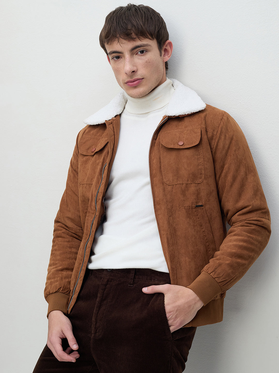 ICONIC Men Brown Suede Detachable Collar Jacket