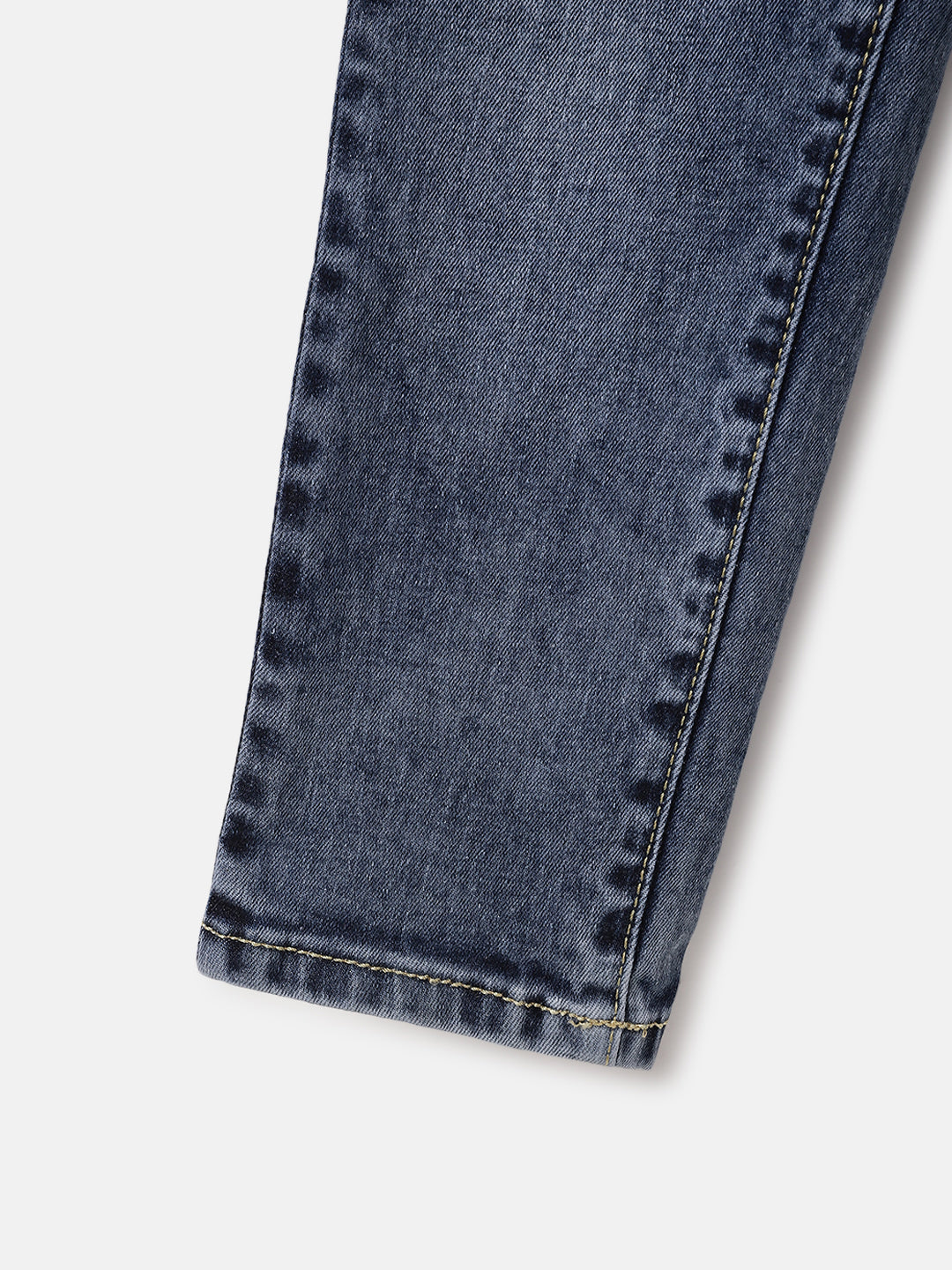 These blue jeans are the perfect blend of style and comfort for boys they feature a straight fit that flatters every body type and a mid rise that sits comfortably on the waist the button and zipper closure ensures a secure fit while the cotton fabric provides all day comfort the printed design adds a touch of personality while the back pocket embroidery adds a touch of sophistication the stretchable fabric allows for maximum movement and flexibility making these jeans perfect for any occasion