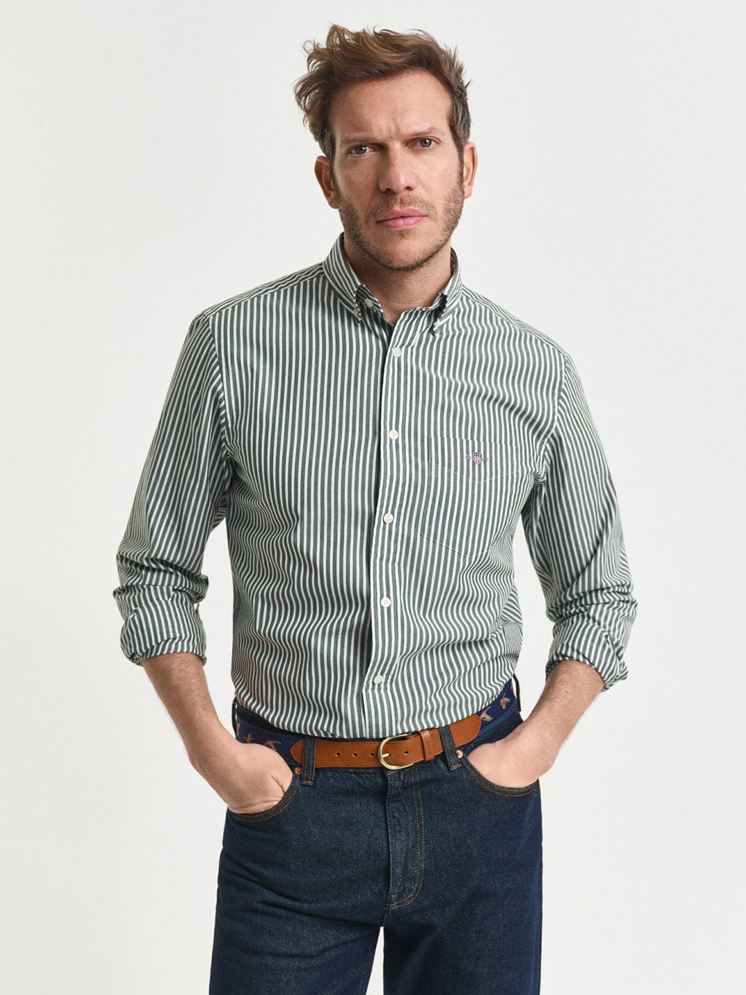 An epitome of elegant tailoring is this poplin shirt by GANT. It displays stripe pattern for a timeless appeal. Featuring a button-down collar and a chest pocket on the left, it is styled with back pleats for a classy effect. Team this shirt with a pair of solid chinos or to make a lasting fashion impression.