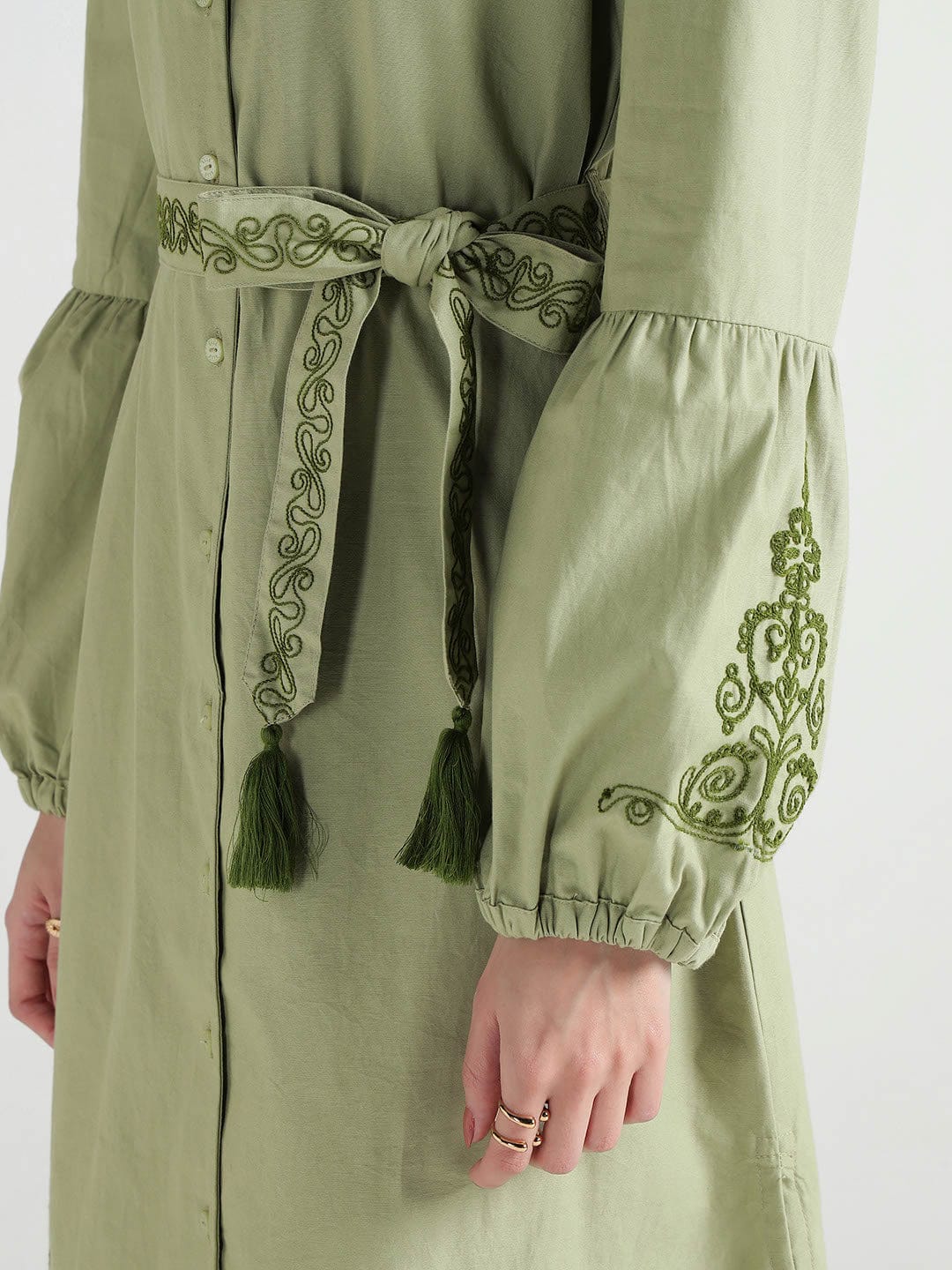 A band collar with button front adds structure to this olive dress. Fabric is cotton making it breathable and soft for everyday wear. Fit and flare style with calf length keeps it elegant yet casual. Embroidery details lift the solid tone and tie it with the fashion trend. Full sleeves complete the look for seasonal comfort.