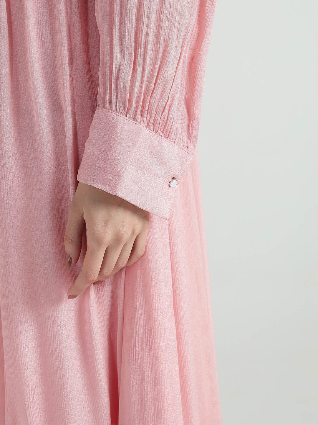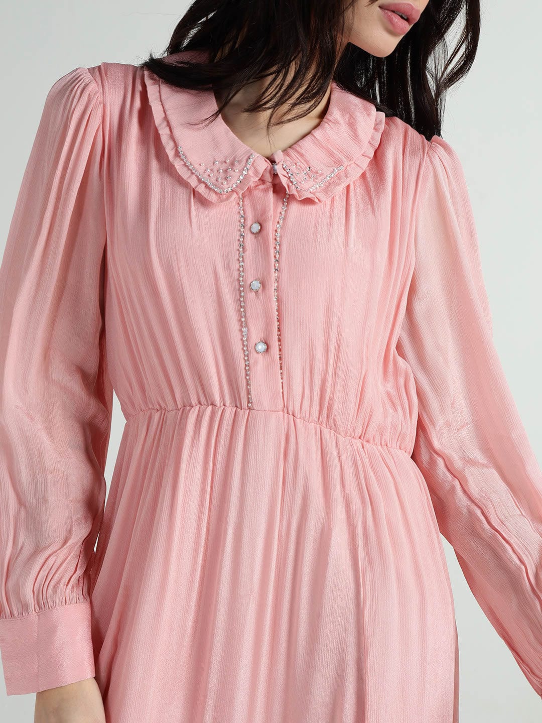 A collared neckline with full sleeves gives this dress a graceful party look. Fabric is cotton which keeps it comfortable and breathable. Fit and flare cut with calf length adds movement while the solid pink shade ties in with current fashion. Studding at the front and pearl beading at the neck add a touch of detail for special occasions.