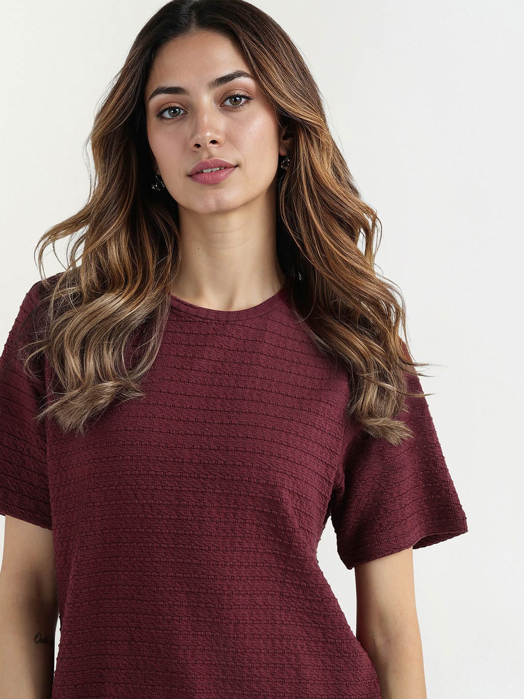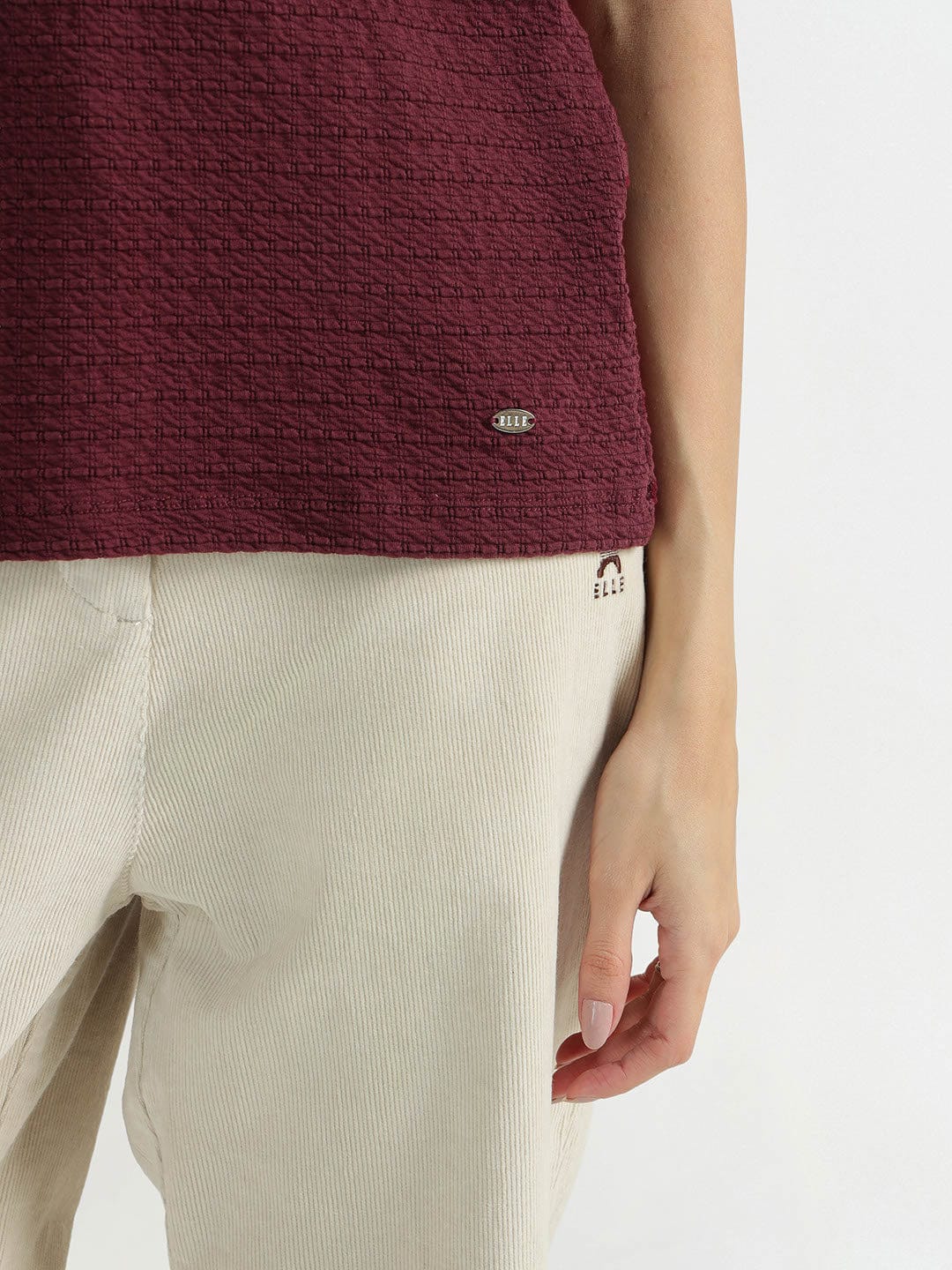 Designed in a slim fit this wine tee brings a neat close-to-body look. Fabric blend of polyester cotton and elastane gives it softness with stretch for comfort. Crew neck with half sleeves keeps the style classic. Subtle Elle branding and textured finish keep it trendy while staying versatile for casual wear.