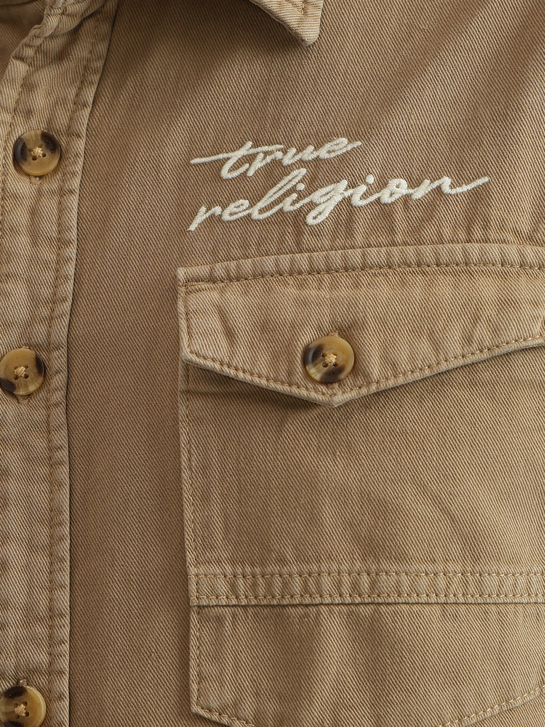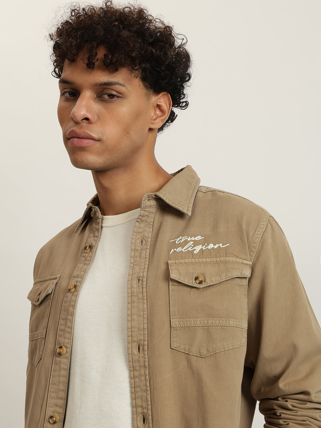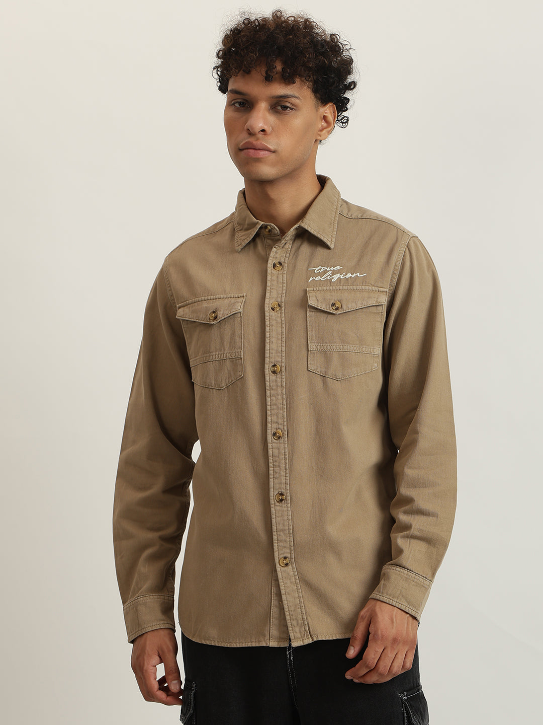 Elevate your style with this classic beige shirt. Crafted from pure cotton, it features a comfortable regular fit, full sleeves, and a spread collar. Intricate embroidery adds a touch of sophistication. The button closure ensures a polished look. Perfect for both casual and formal occasions.