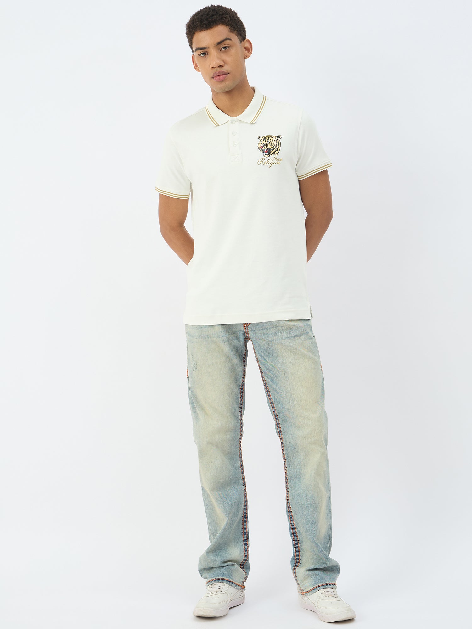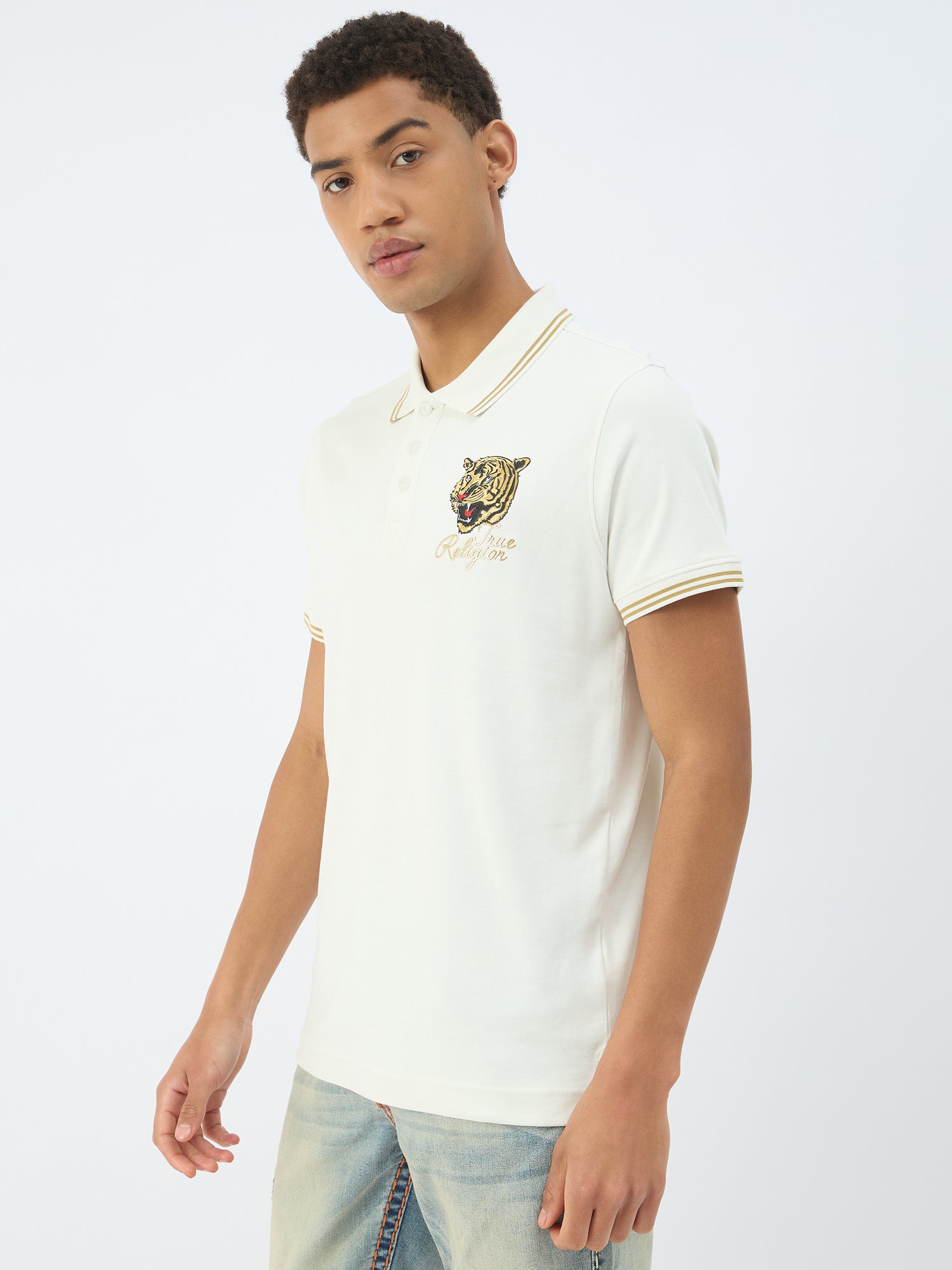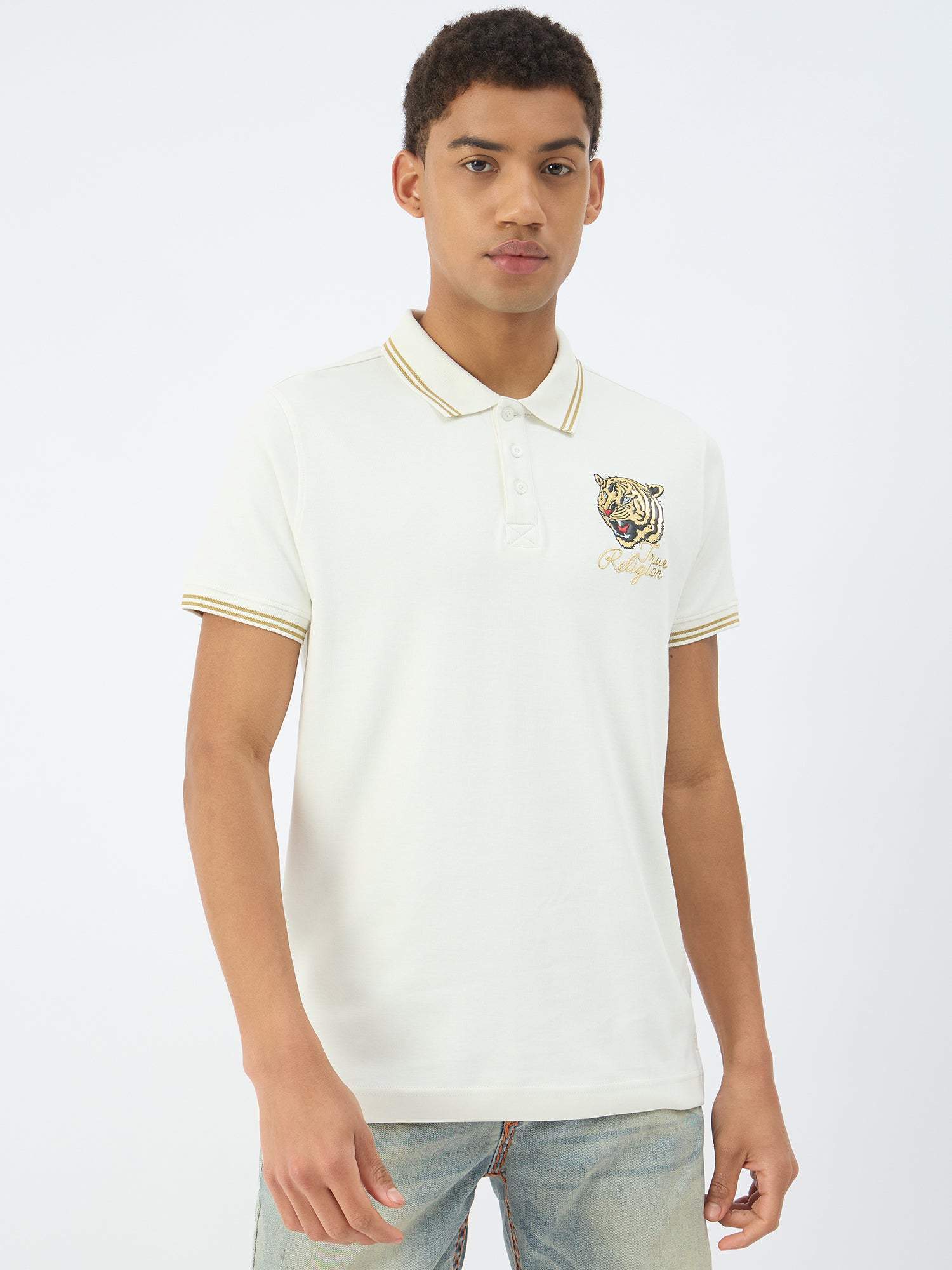 This men's polo shirt is crafted from pure cotton for a soft and breathable feel. It features a classic polo collar with a button closure and short sleeves for a timeless look. The regular fit provides a comfortable and flattering silhouette. The solid cream color is versatile and easy to style. The fabric is also stretchable for added comfort and movement.