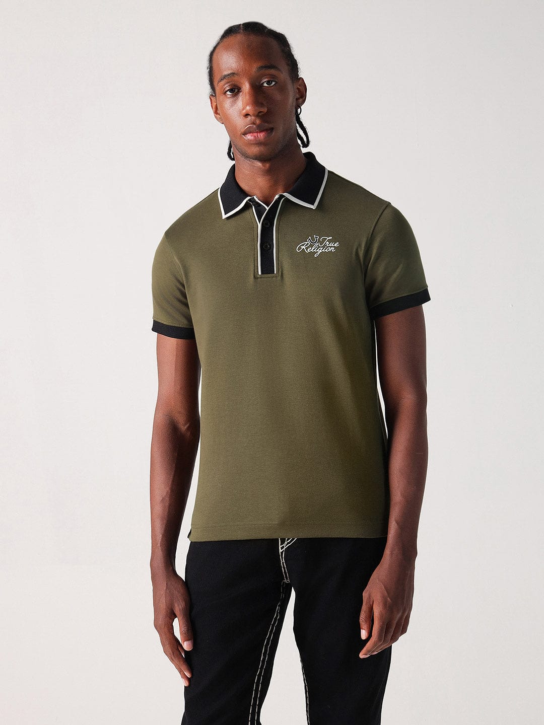 This TRUE RELIGION Men Dark Olive Polo neck Pullover crafted from a luxurious blend. This solid polo shirt features short sleeves and a regular fit for ultimate comfort and style. Whether you are dressing up for a night out or keeping it laid-back for the weekend. This versatile piece is the perfect addition to your wardrobe. Stay effortlessly cool and fashionable with this must-have staple.