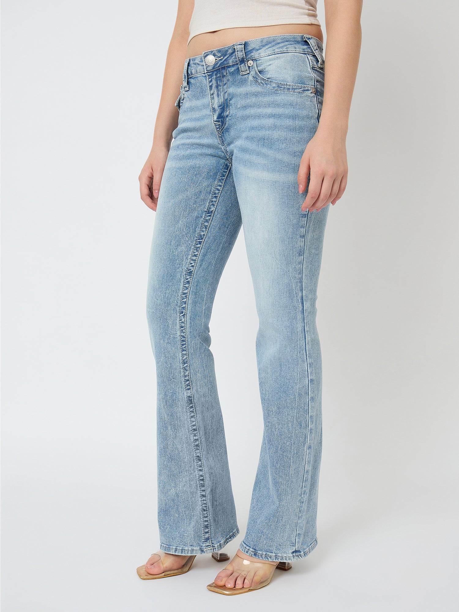 Add a stylish edge to your wardrobe with these blue jeans for women featuring a boot cut and a trendy washed pattern. Made from a soft and durable cotton blend fabric they offer lasting comfort and a flattering fit. The mid rise waist sits comfortably while the button and zipper closure make them easy to wear. Designed to pair well with boots or heels these jeans are perfect for casual outings or everyday wear offering both style and versatility in one easy look.