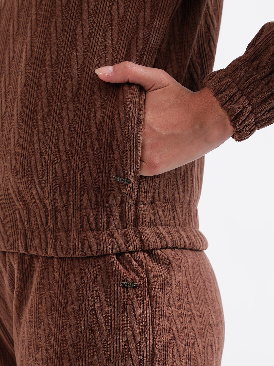 Elle Women Brown Self-Design Spread Collar Full Sleeves Zip Through Hoodie