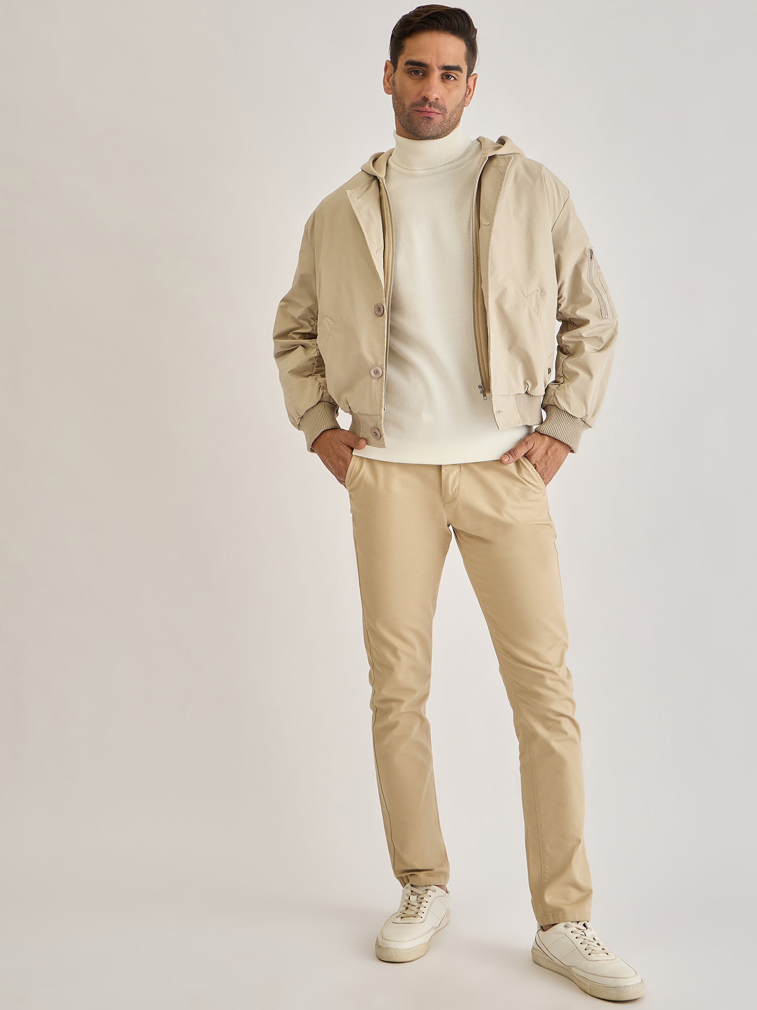 Stay warm and stylish in this beige quilted jacket. Featuring a regular fit, full sleeves, a cozy hood, and a zip closure, this jacket is crafted from a comfortable poly cotton blend. Perfect for layering on chilly days.