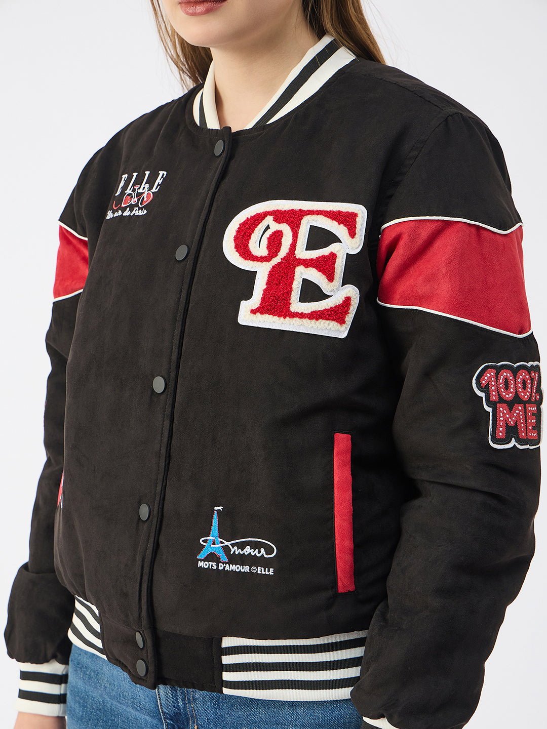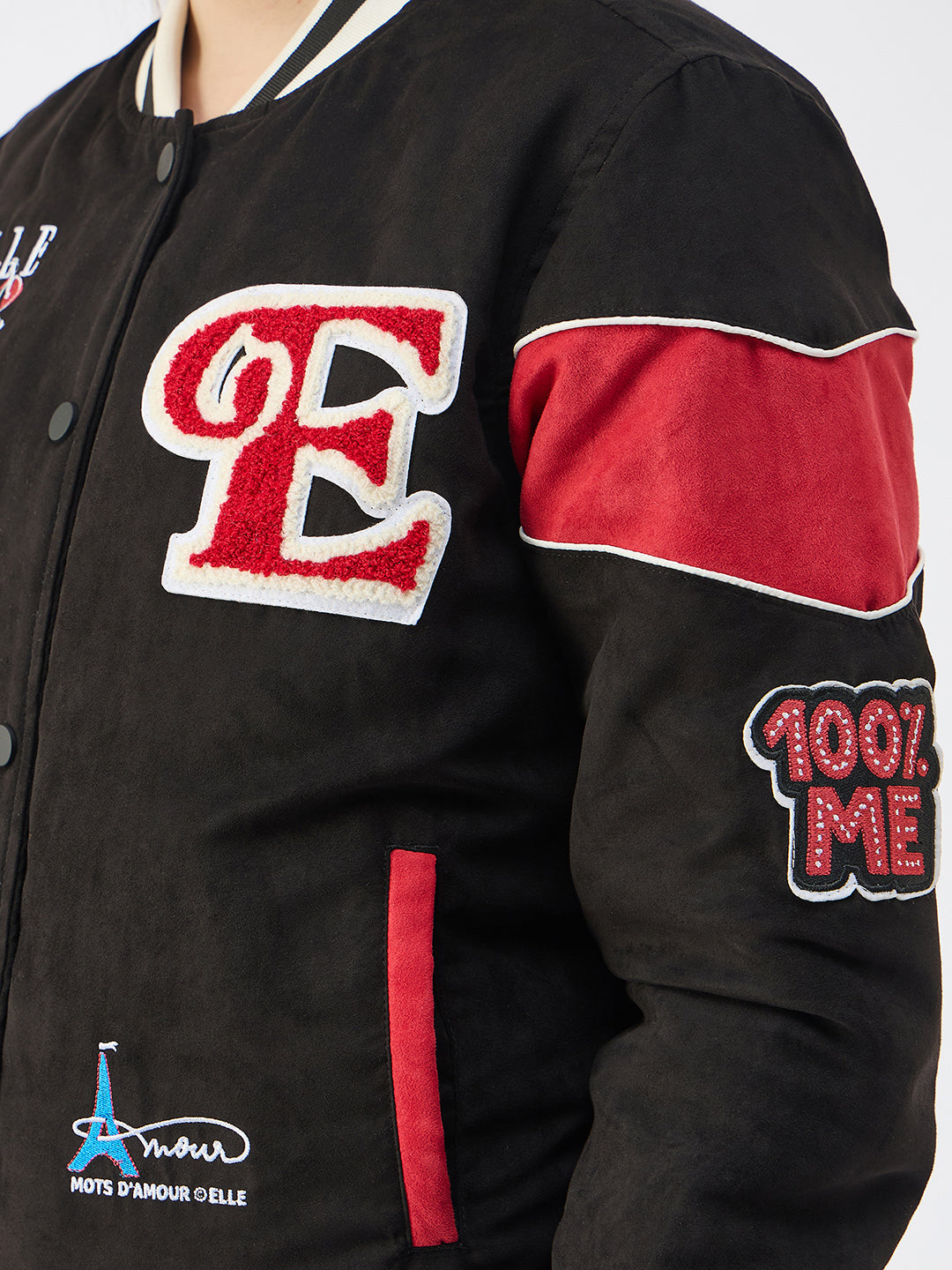 Embrace effortless cool in this black varsity jacket, crafted for a relaxed fit that moves with you. The full sleeves and stand collar offer a classic silhouette, while the intricate embroidered pattern adds a touch of vintage charm. Made from soft, durable polyester, this jacket is both stylish and comfortable, perfect for layering over your favorite outfits. Whether you're heading to class, grabbing coffee with friends, or exploring the city, this varsity jacket will keep you looking and feeling confident.