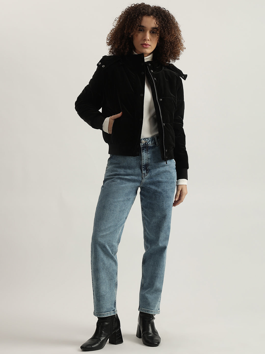 Stay stylish and warm in this sleek black bomber jacket. Featuring a detachable hood, full sleeves, and a snap button closure, this regular-fit jacket is crafted from comfortable polyester fabric. Perfect for layering on chilly days.