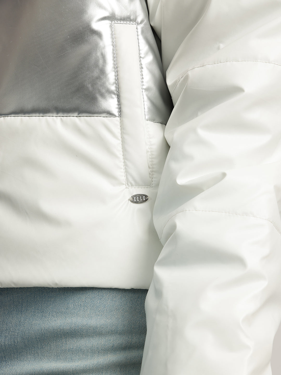 Embrace bold style with this oversized white jacket. Featuring a color-blocked pattern, full sleeves, a spread collar, and a zip closure, this polyester jacket is both chic and comfortable. Perfect for layering and adding a pop of color to any outfit.