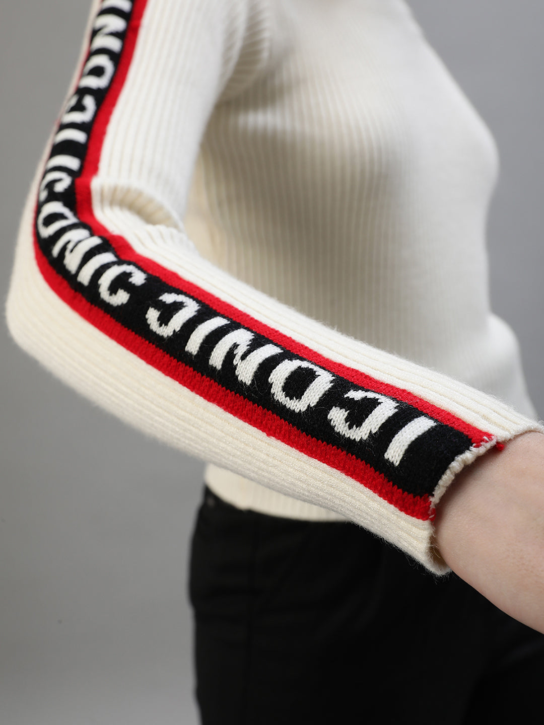 Step out in style with this off-white high neck sweater, featuring a chic colour-blocked design.Made with a luxurious viscose blend, it promises softness and durability.Its full sleeves ensure warmth, making it a must-have for those chilly days.
