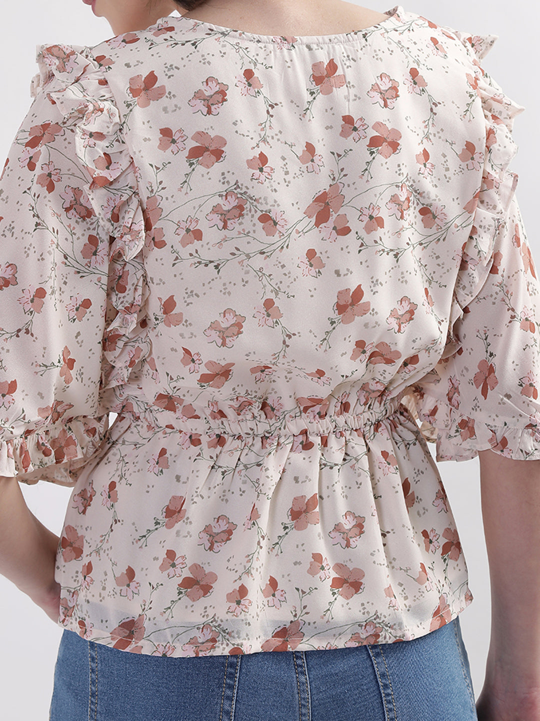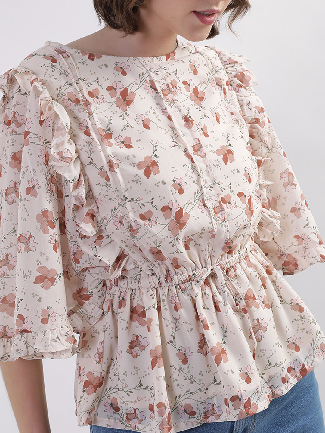 Elle Womens All Over Floral Print Top With Round Neck And Ruffles. It Has 3/4 Sleeves With Ruffles And Draw Cord At Waist