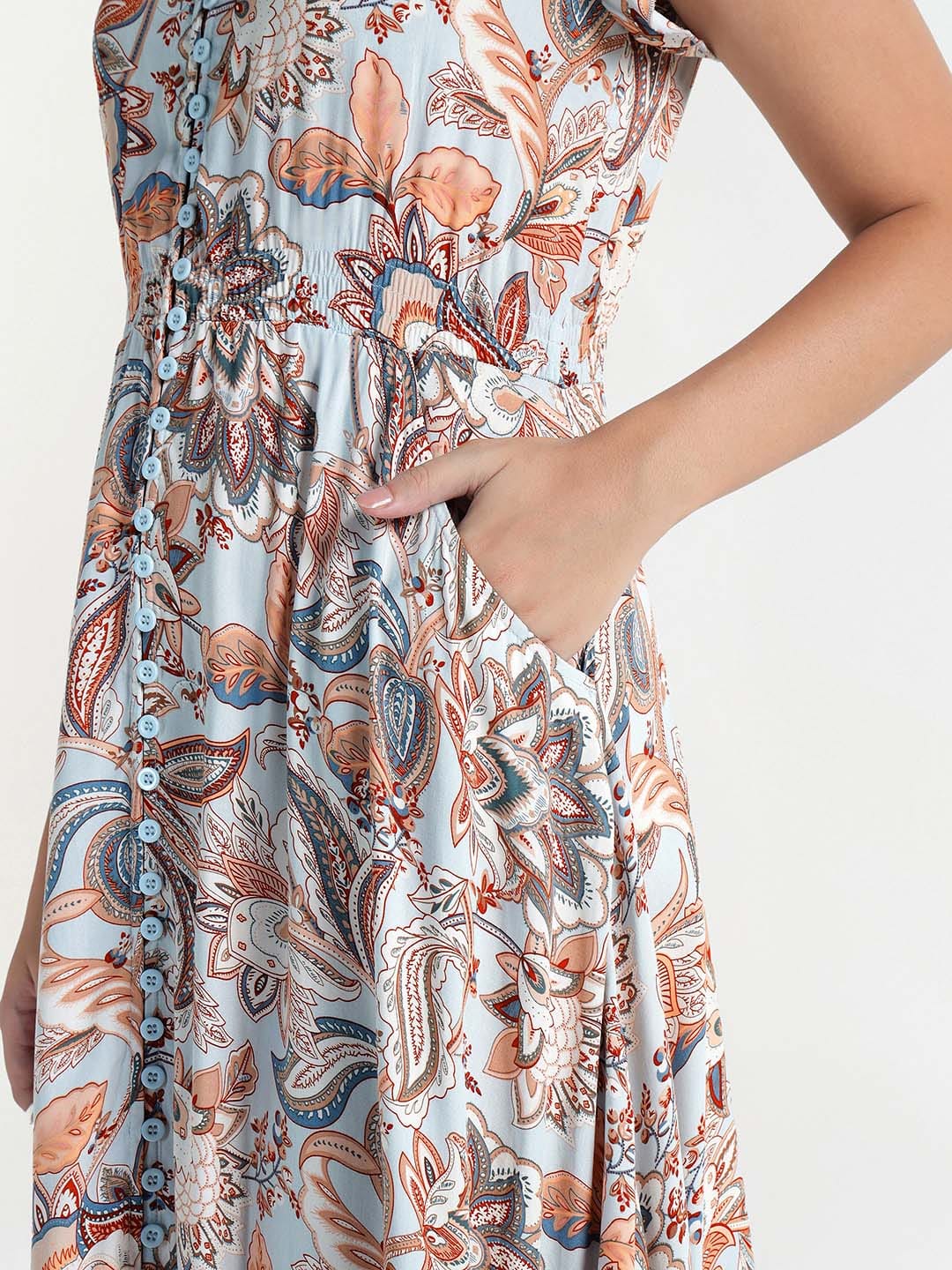 A v-neckline with front loop buttons gives this dress a neat feminine touch. Fabric is pure viscose making it light with a soft flow that drapes well. The fit and flare cut keeps it flattering while half sleeves balance comfort. Blue base with all-over print follows the seasonal trend and works easily for casual outings or day wear.