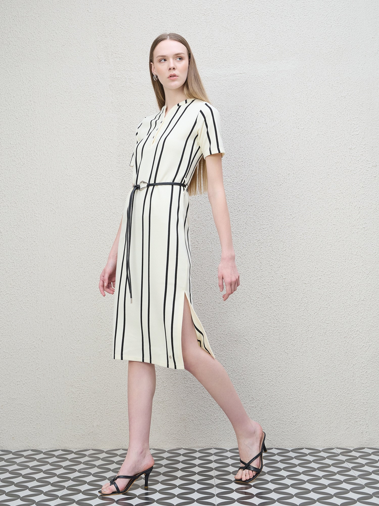 Elevate your wardrobe with this chic white midi dress, designed for the modern woman who values style and comfort. Crafted from pure cotton fabric, this dress features a flattering body fit with a classic striped pattern that adds a touch of sophistication. The short sleeves and v-placket band enhance its elegant appeal, while the button closure ensures ease of wear. An added belt accentuates your waistline, offering a tailored look. The knit stripes are stretchable, providing flexibility and comfort throughout the day. Perfect for any occasion, this dress is a versatile addition to your collection.
