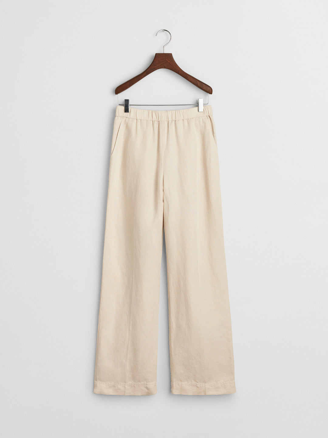 Embrace effortless chic in these wide-leg linen blend trousers. The relaxed fit and beige hue create a timeless silhouette, while the elasticated waistband ensures comfort. Crafted from a breathable linen blend, these trousers are perfect for warm days. Style them with a flowy top and sandals for a breezy summer look.