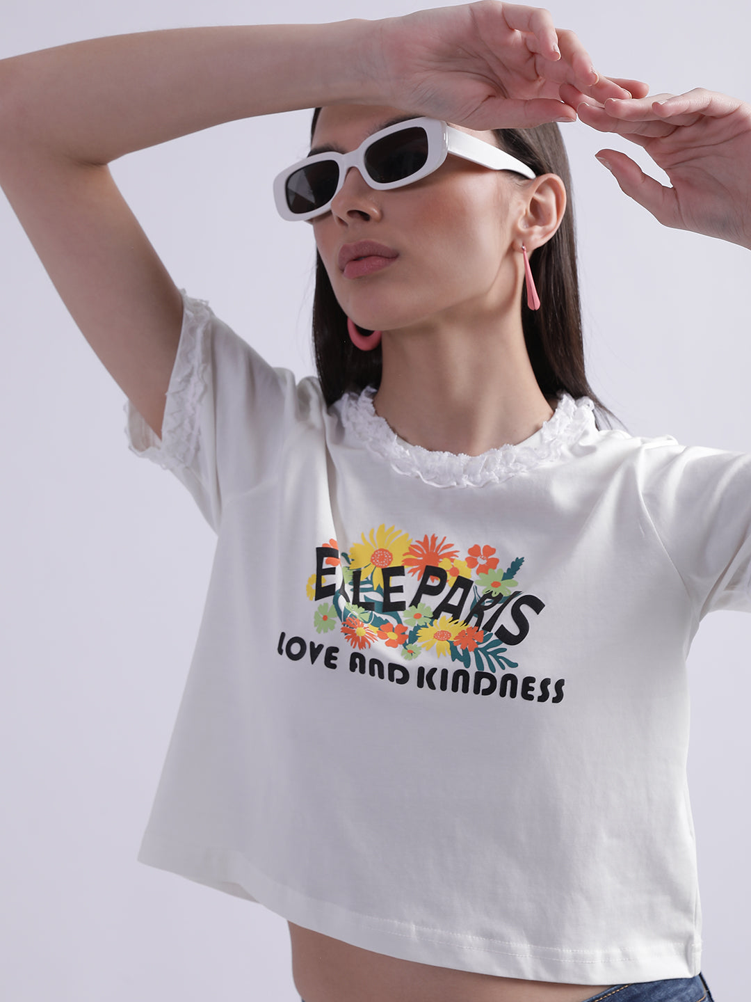 Elle Women White Printed Round Neck Short Sleeves Tshirt