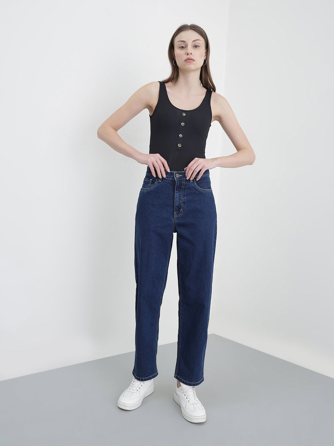 Women Blue Solid Mom Fit Jeans
