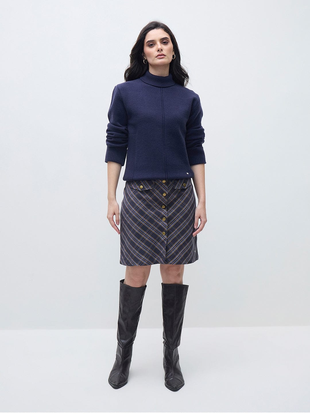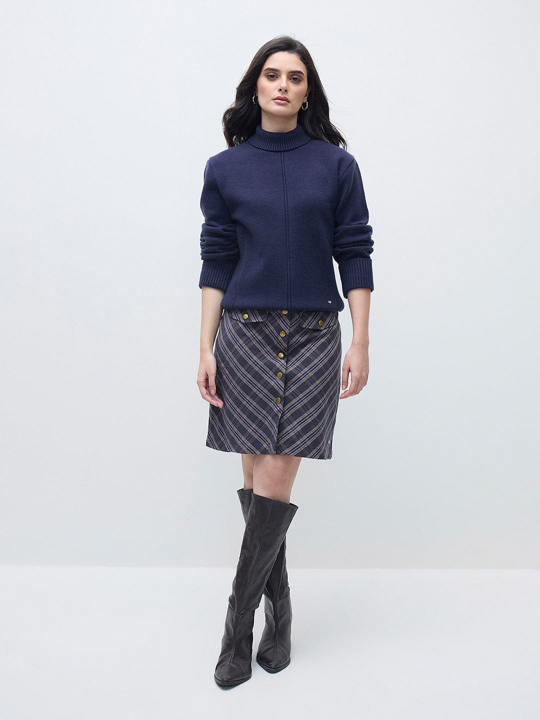 ELLE Women Navy Blue Blended Solid High Neck Sweater