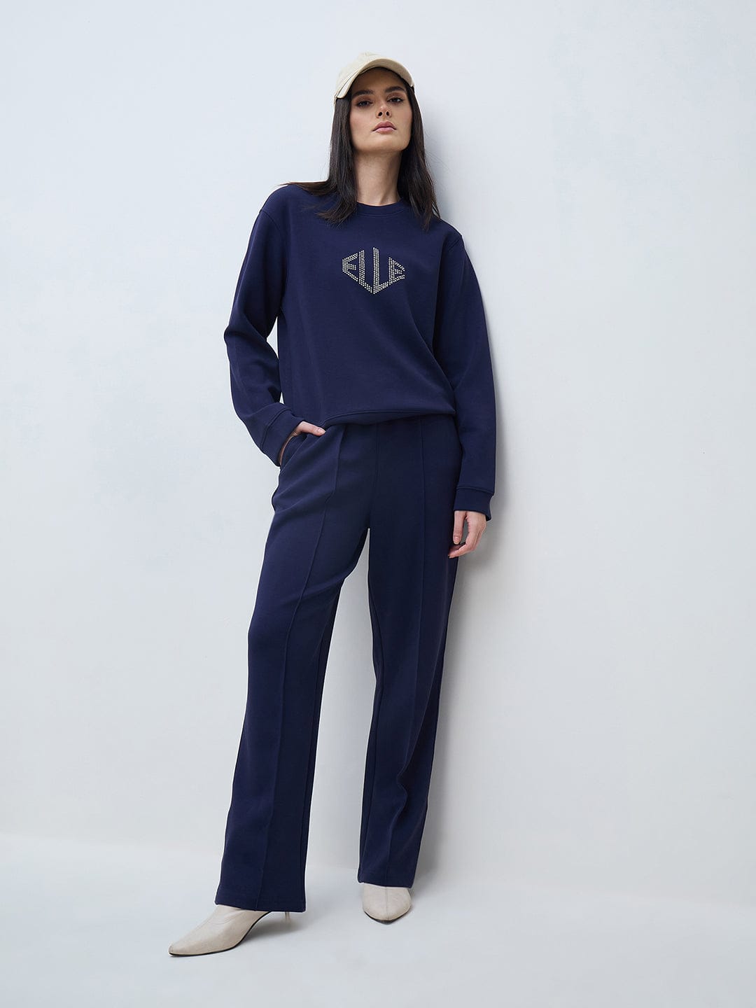 Elle Women Navy Blue Solid Round Neck Sweatshirt