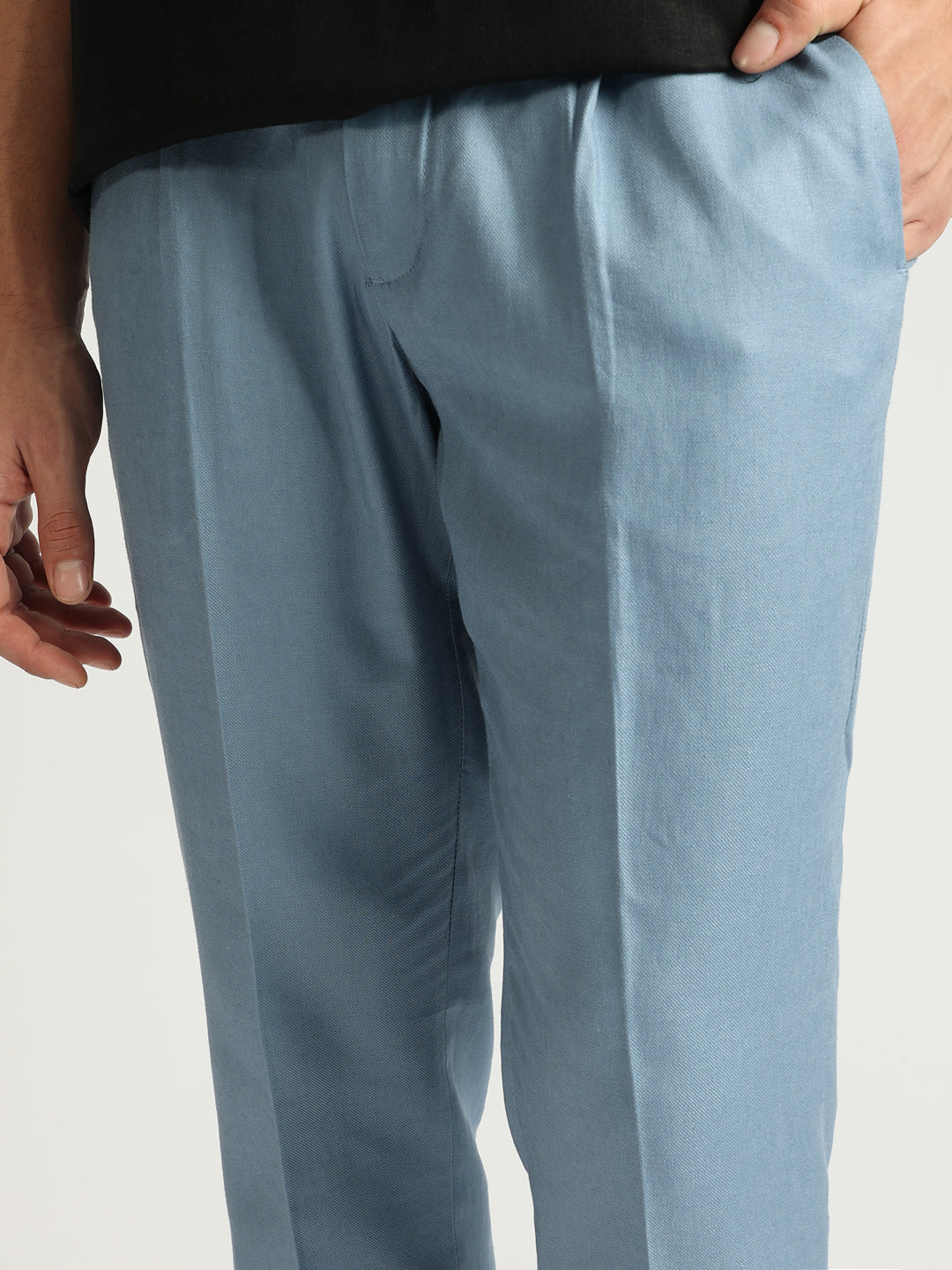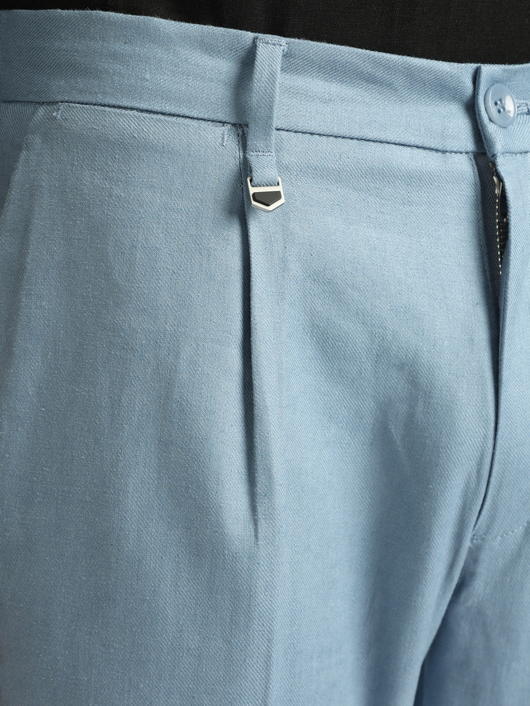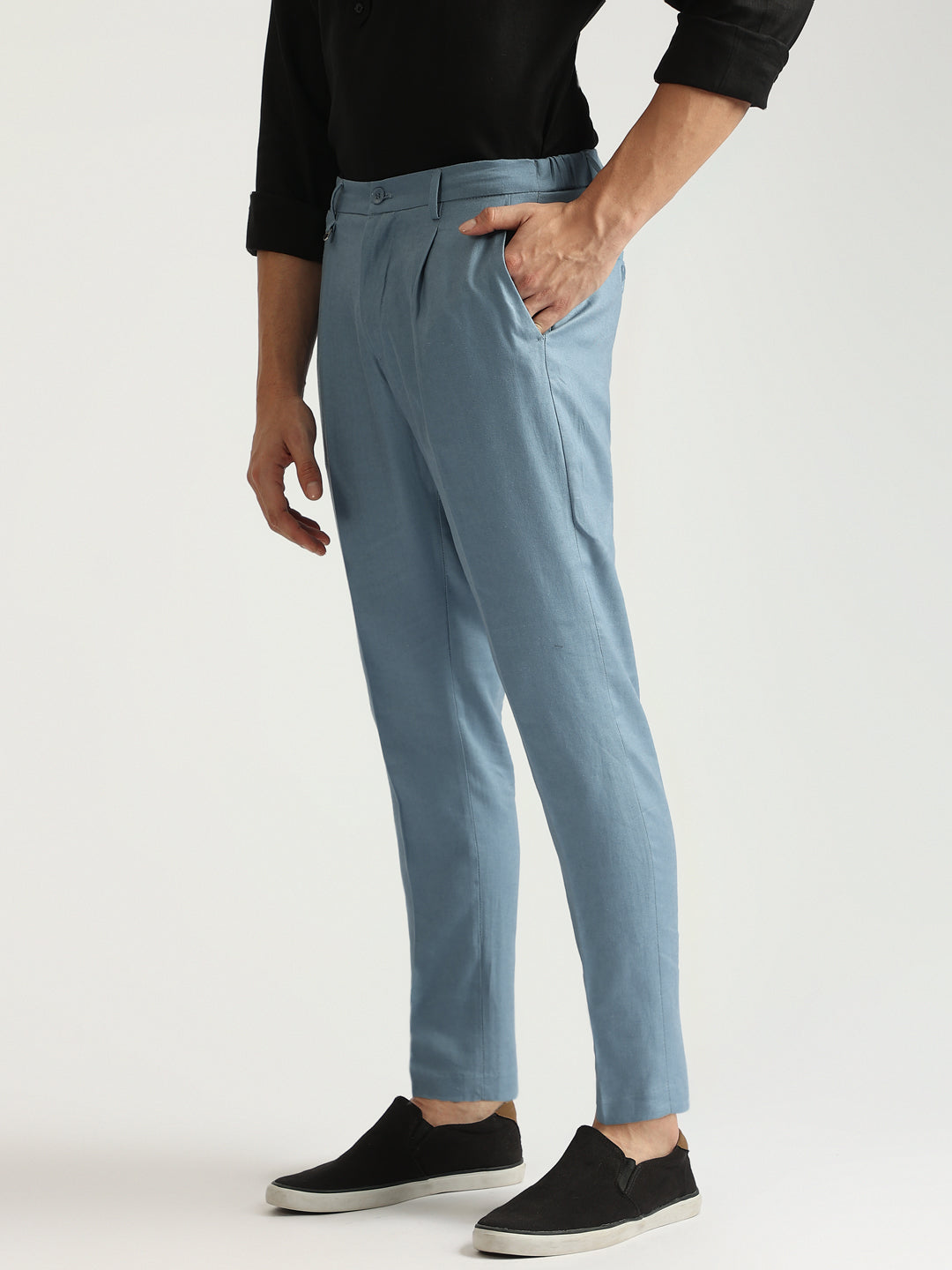 Elevate your style with these sleek, single-pleated trousers. Crafted from a breathable linen blend, they feature a flattering carrot fit, mid-rise waist, and a classic button and zip closure. The solid blue hue adds a touch of sophistication, making them perfect for both casual and smart casual occasions.