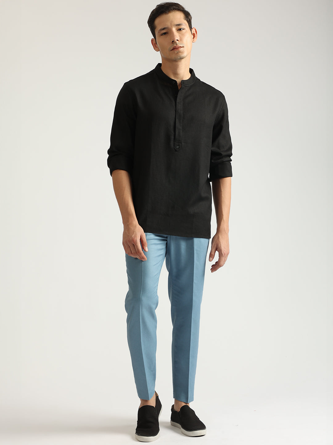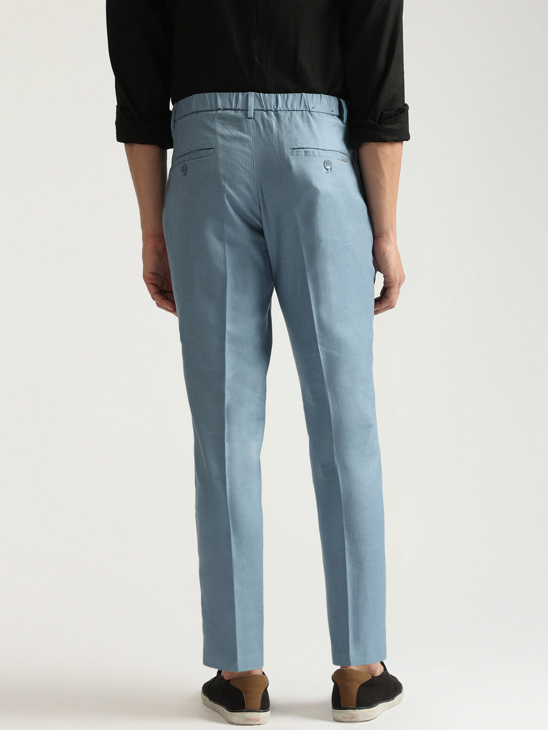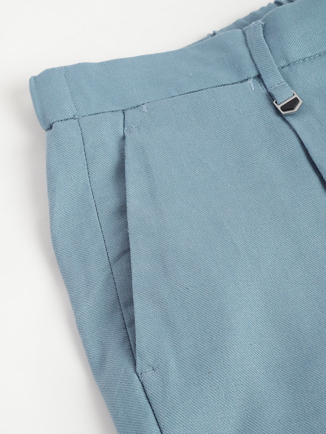 Elevate your style with these sleek, single-pleated trousers. Crafted from a breathable linen blend, they feature a flattering carrot fit, mid-rise waist, and a classic button and zip closure. The solid blue hue adds a touch of sophistication, making them perfect for both casual and smart casual occasions.