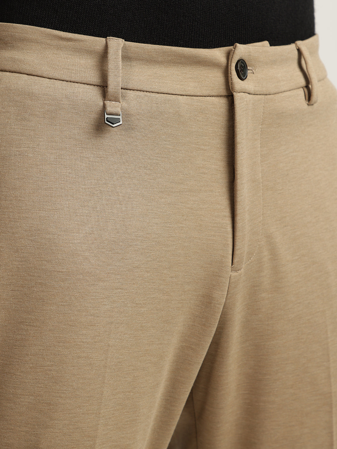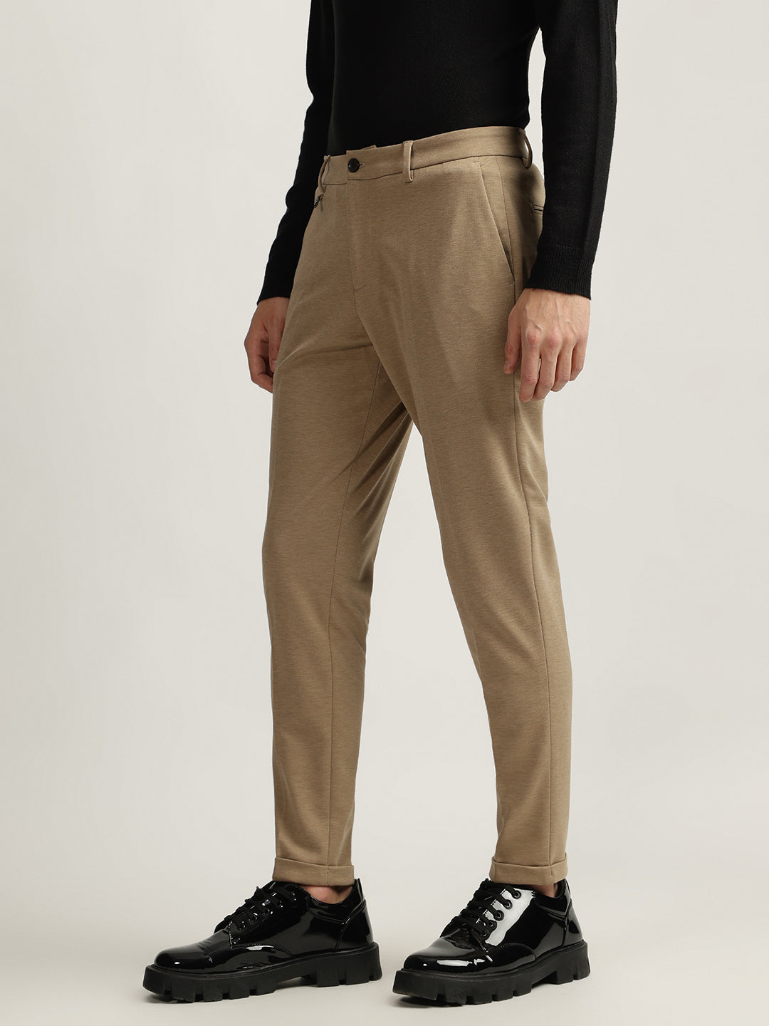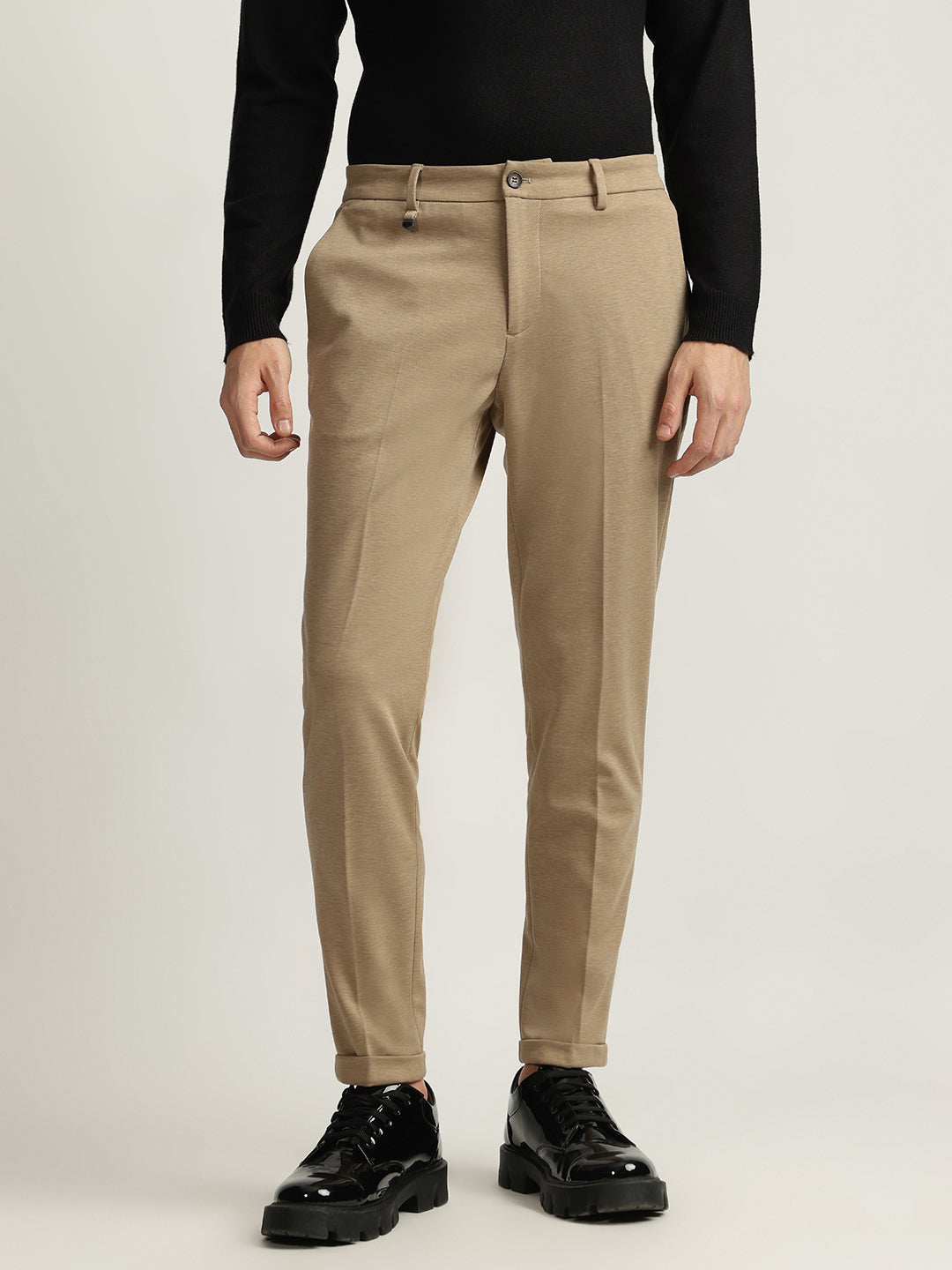 Sleek and sophisticated, these beige flat-front trousers offer a super skinny fit for a modern silhouette. Crafted from a comfortable polyester blend, they feature a mid-rise waist, button and zip closure, and a solid pattern for versatile styling.