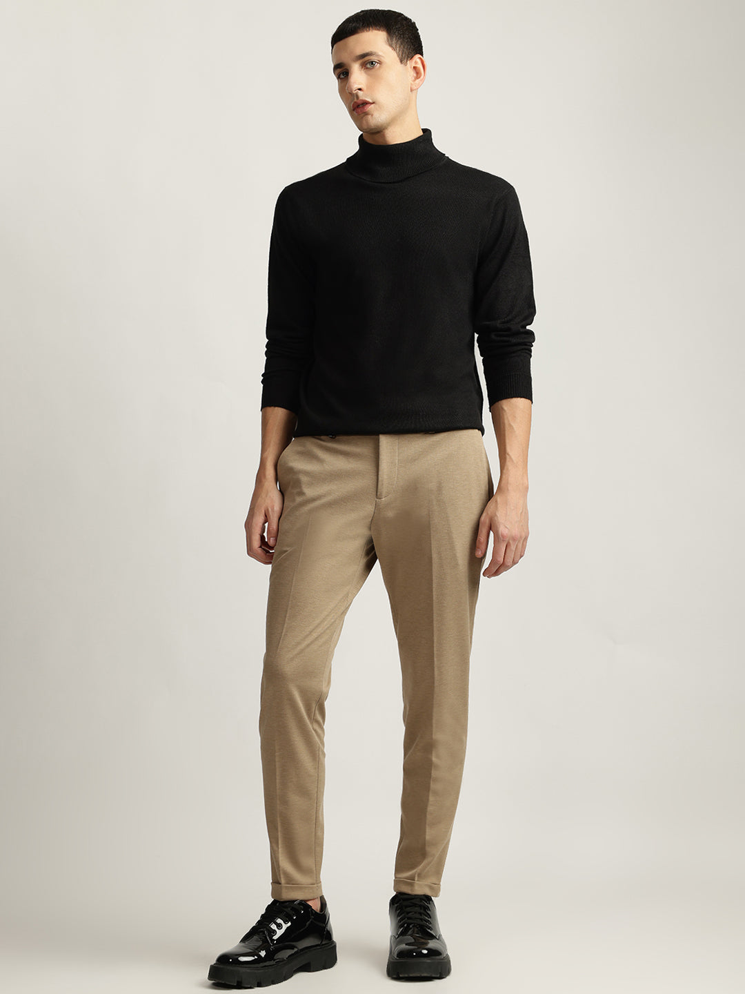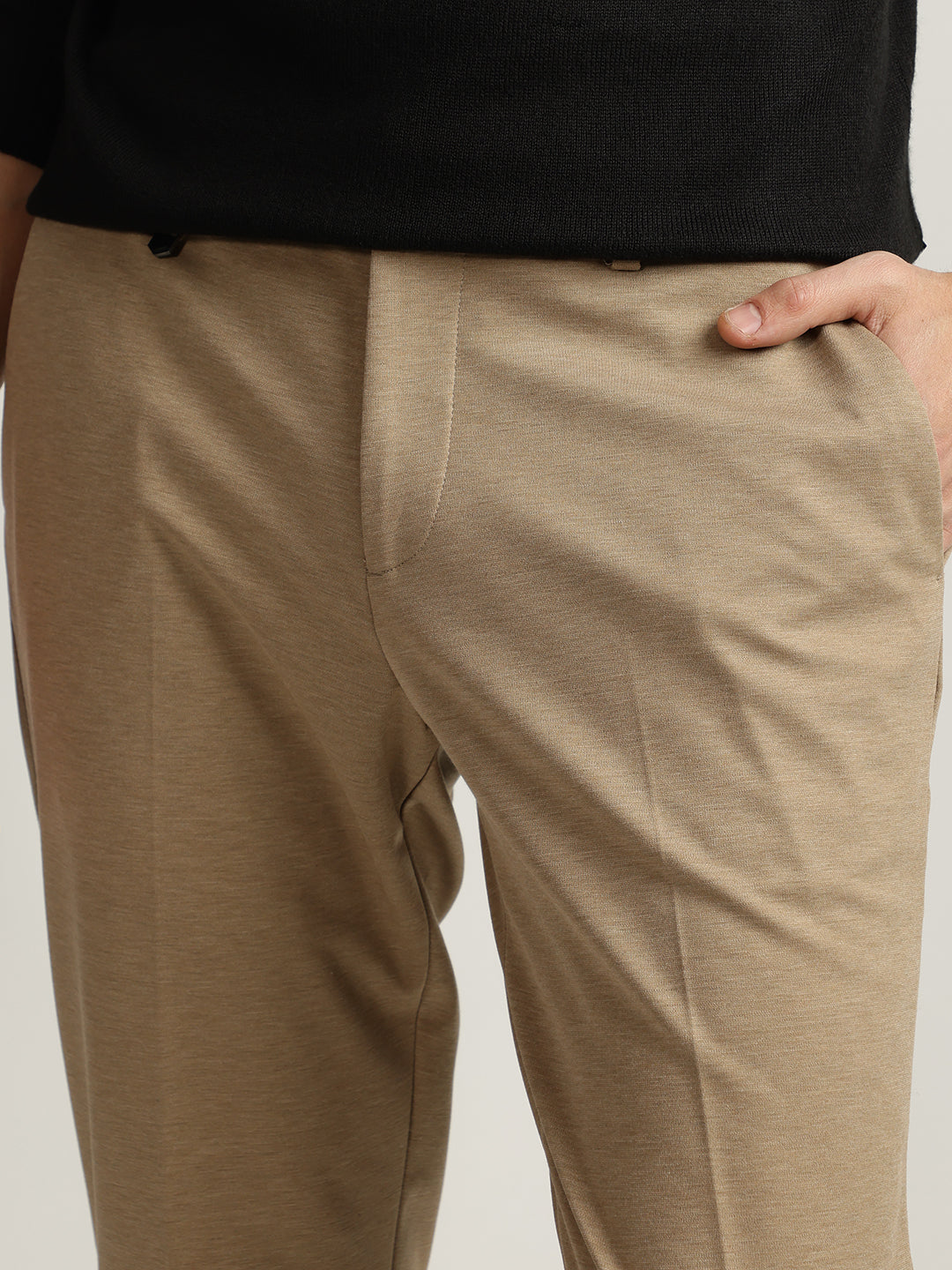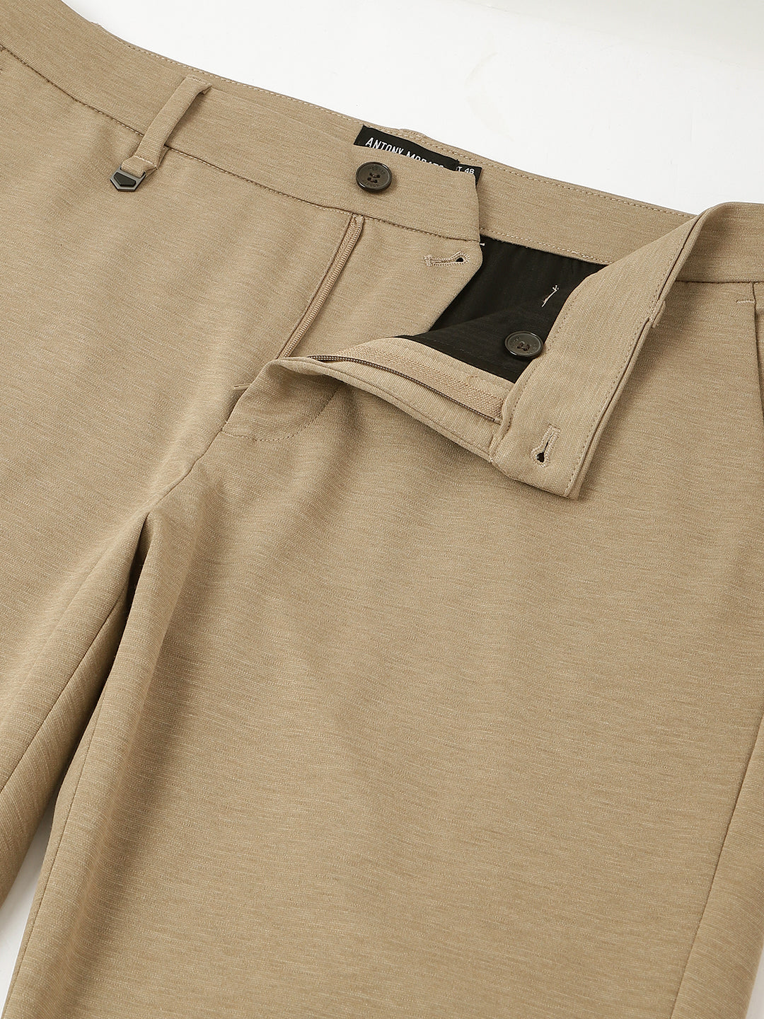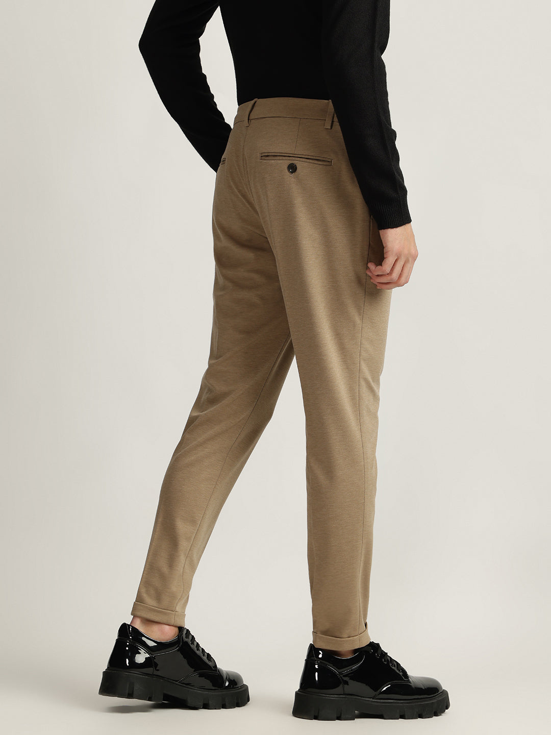 Sleek and sophisticated, these beige flat-front trousers offer a super skinny fit for a modern silhouette. Crafted from a comfortable polyester blend, they feature a mid-rise waist, button and zip closure, and a solid pattern for versatile styling.