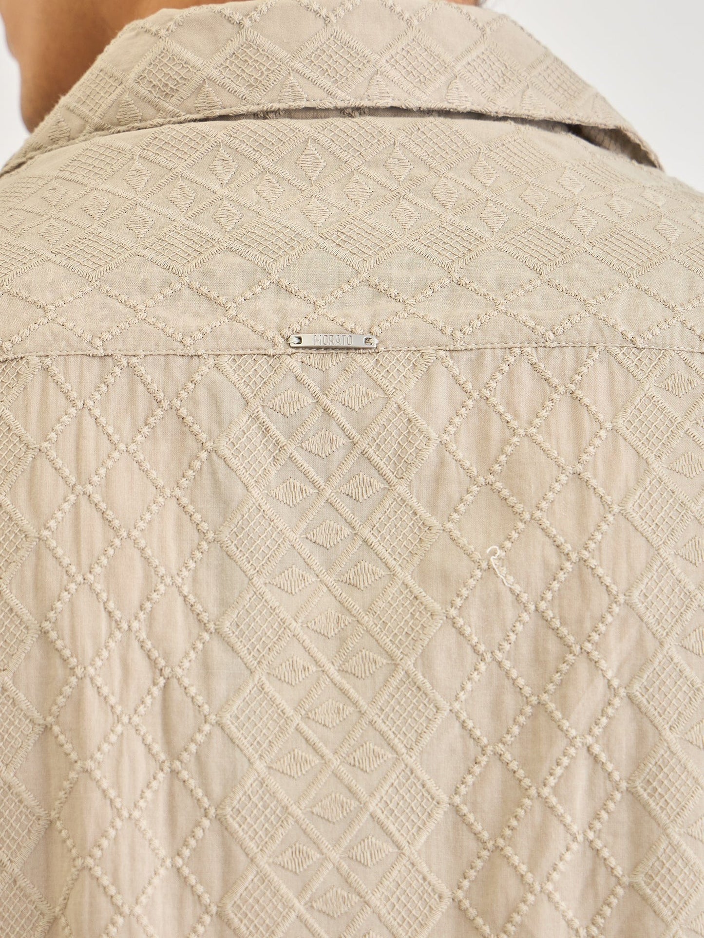 Discover effortless style with our beige embroidered shirt, designed for the modern man. This straight-fit shirt features a resort collar and short sleeves, perfect for casual outings or relaxed gatherings. Crafted from pure cotton fabric, it ensures breathability and comfort throughout the day. The intricate embroidered pattern adds a touch of sophistication, while the button closure offers a classic finish. Ideal for pairing with jeans or chinos, this versatile piece is a must-have addition to your wardrobe.