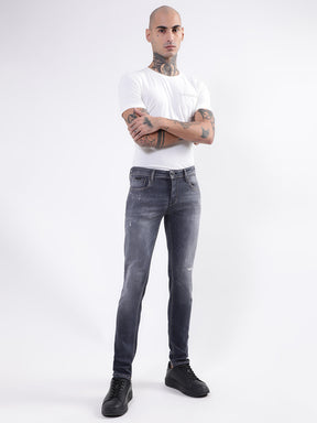 Men Grey Tapered Fit Slash Knee Light Fade Stretchable Cotton Jeans