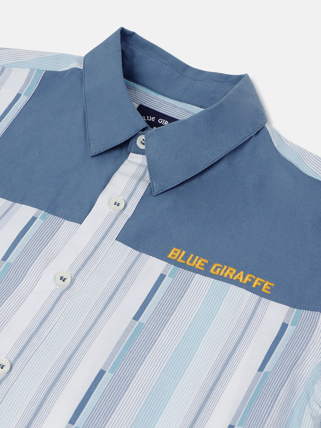 Introducing the iconic Blue Giraffe Boys Striped Shirt With Solid Yoke. Crafted with 100% cotton, this shirt is perfect for any occasion.
