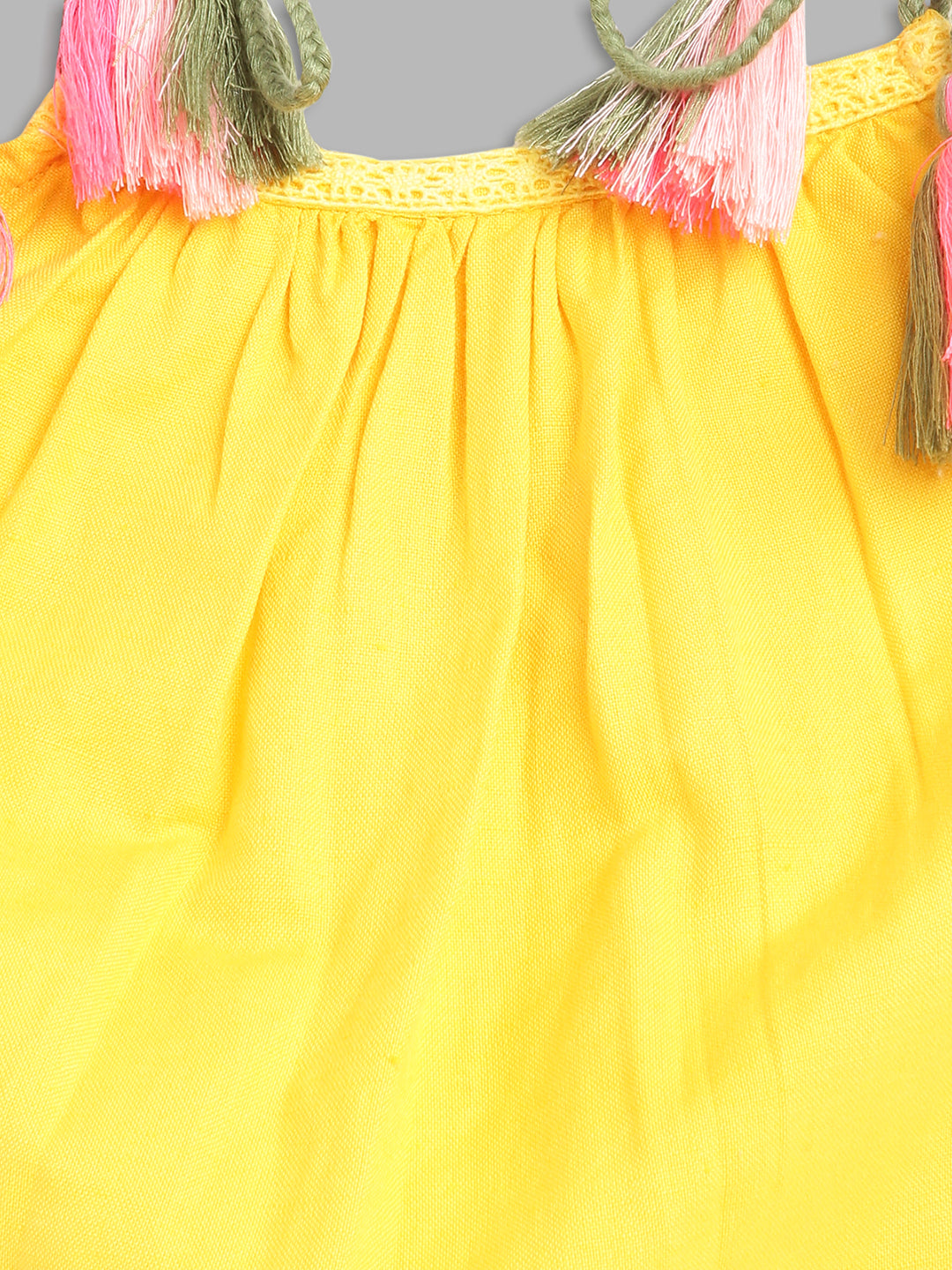 Brighten up her wardrobe with this charming yellow top! Featuring a flared fit and exquisite embroidery, this sleeveless design boasts comfortable shoulder straps and soft cotton fabric. Easy pull-on closure ensures hassle-free dressing. Perfect for sunny days and playful outings!