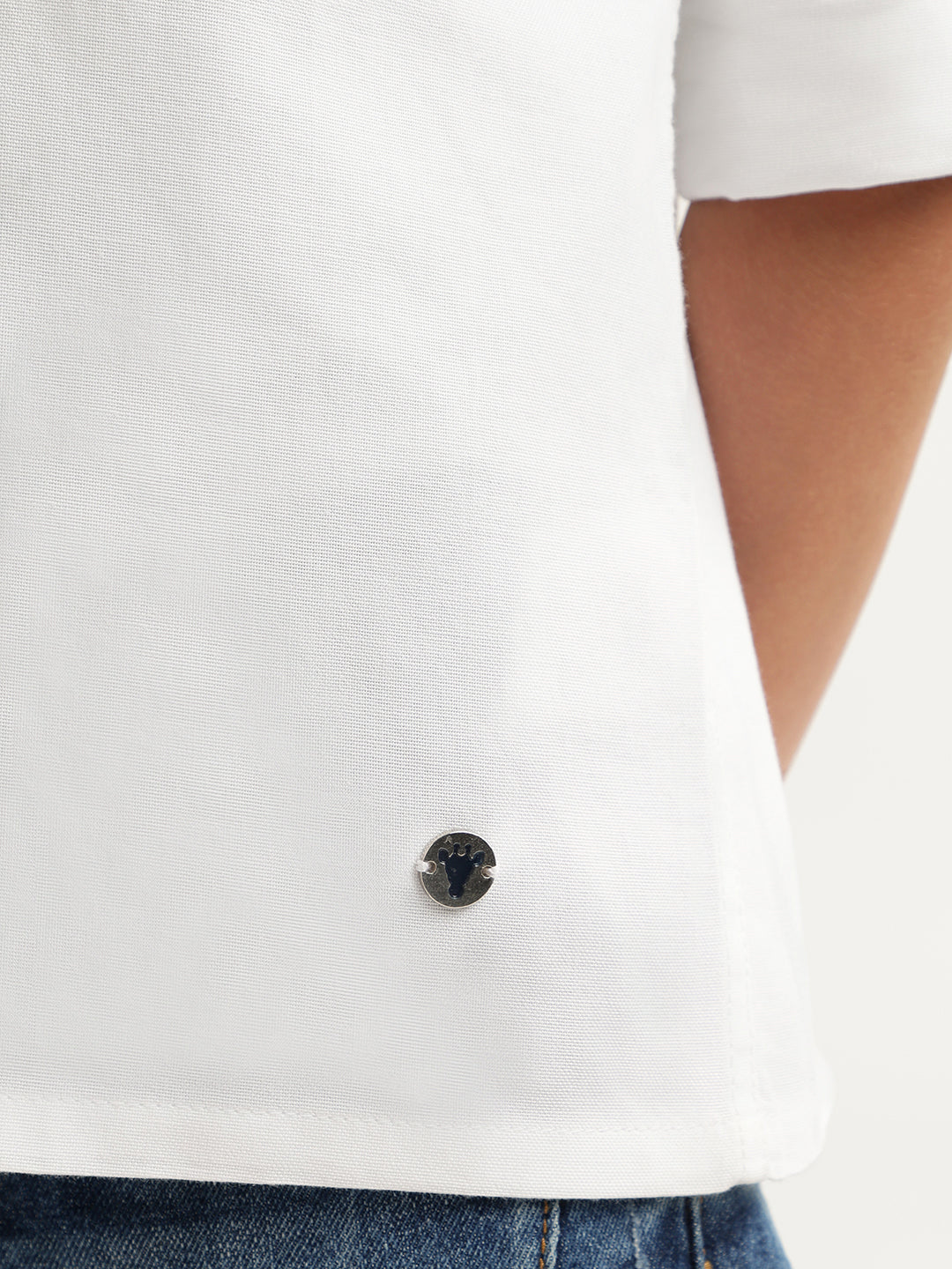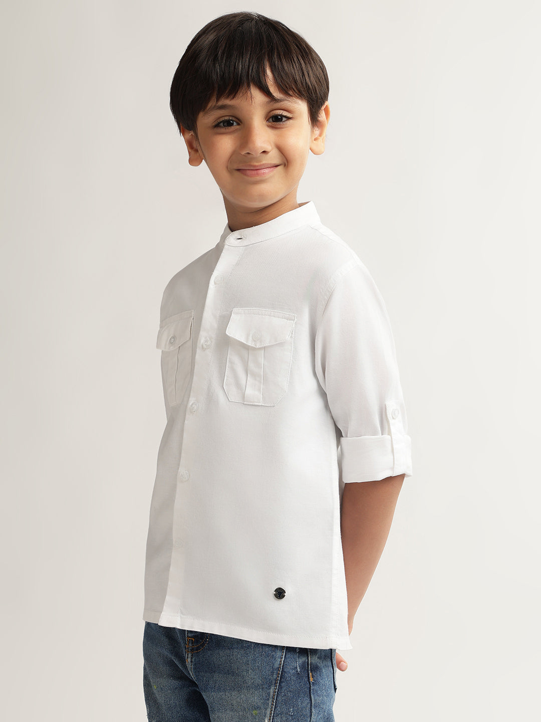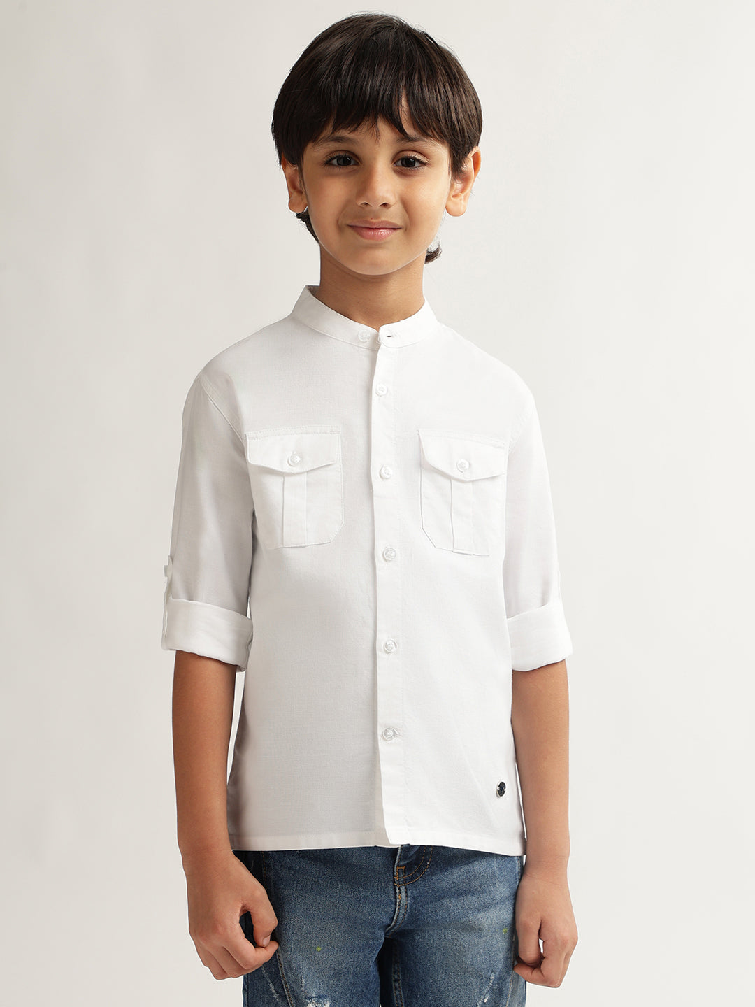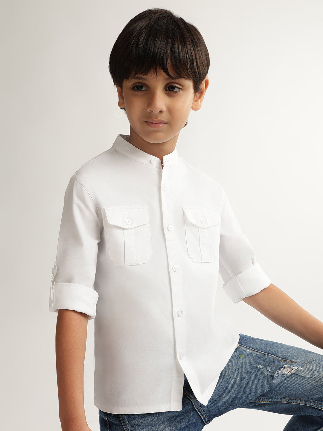 Introducing our classic white shirt for boys, designed with a regular fit and solid pattern. This versatile piece features full sleeves, a band collar, and button closure. Perfect for any occasion, it effortlessly combines style and comfort.