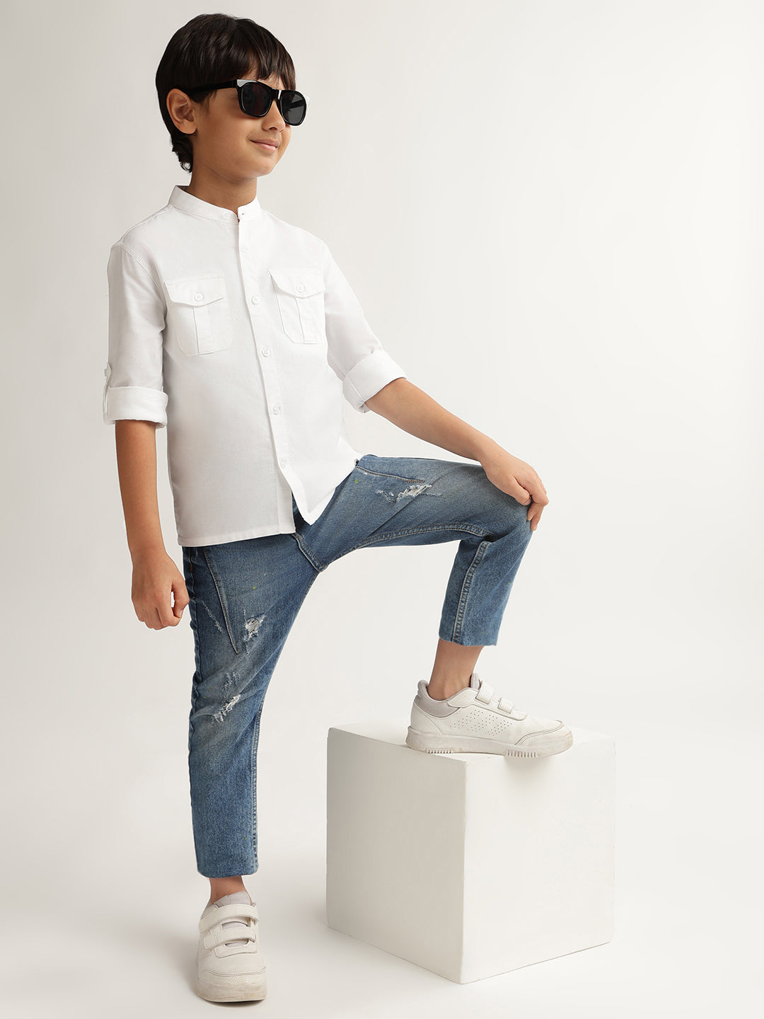 Blue Giraffe Boys White Solid Band Collar Full Sleeves Shirt