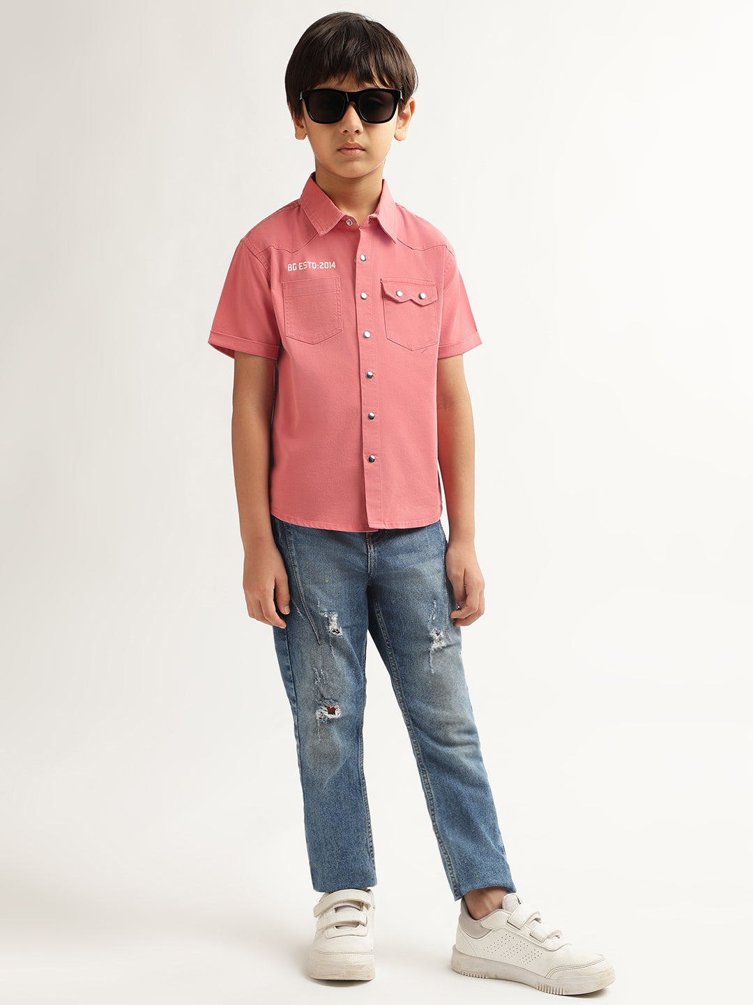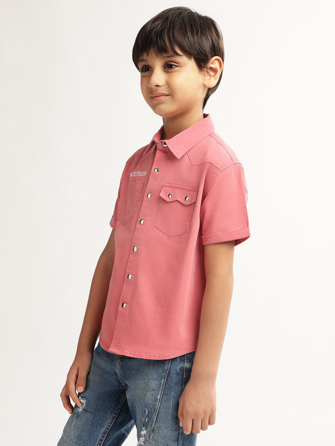 Introducing our stylish pink shirt for boys! Crafted with a regular fit, this solid patterned shirt features short sleeves, a spread collar, and a convenient button closure. Perfect for any occasion, it adds a touch of sophistication to your little one's wardrobe.