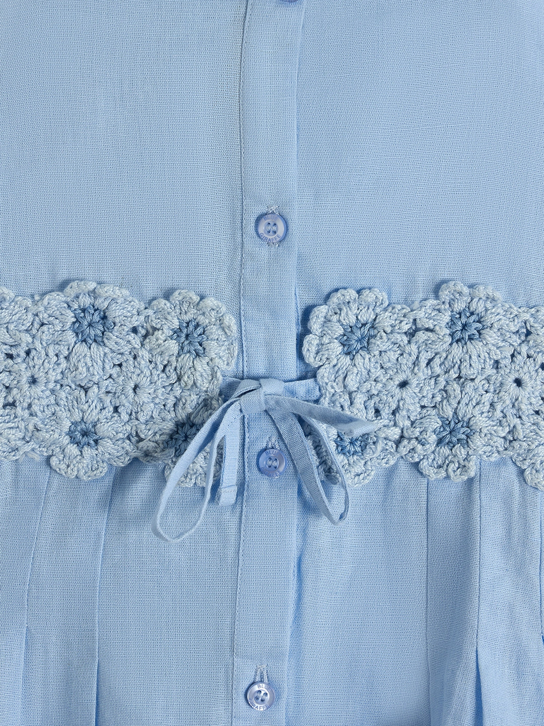 A breezy blue dream! This sleeveless crochet top features a charming self-design pattern, a flattering fit-and-flare silhouette, and delicate shoulder straps. Crafted from soft cotton, it's finished with a sweet button closure.