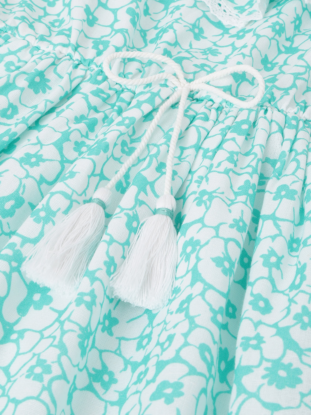 Charming white fit and flare dress for girls. This sleeveless, v-neck piece boasts a playful printed pattern. Crafted from soft, breathable viscose fabric, it features a practical button closure. Perfect for any occasion, this dress combines comfort and style.