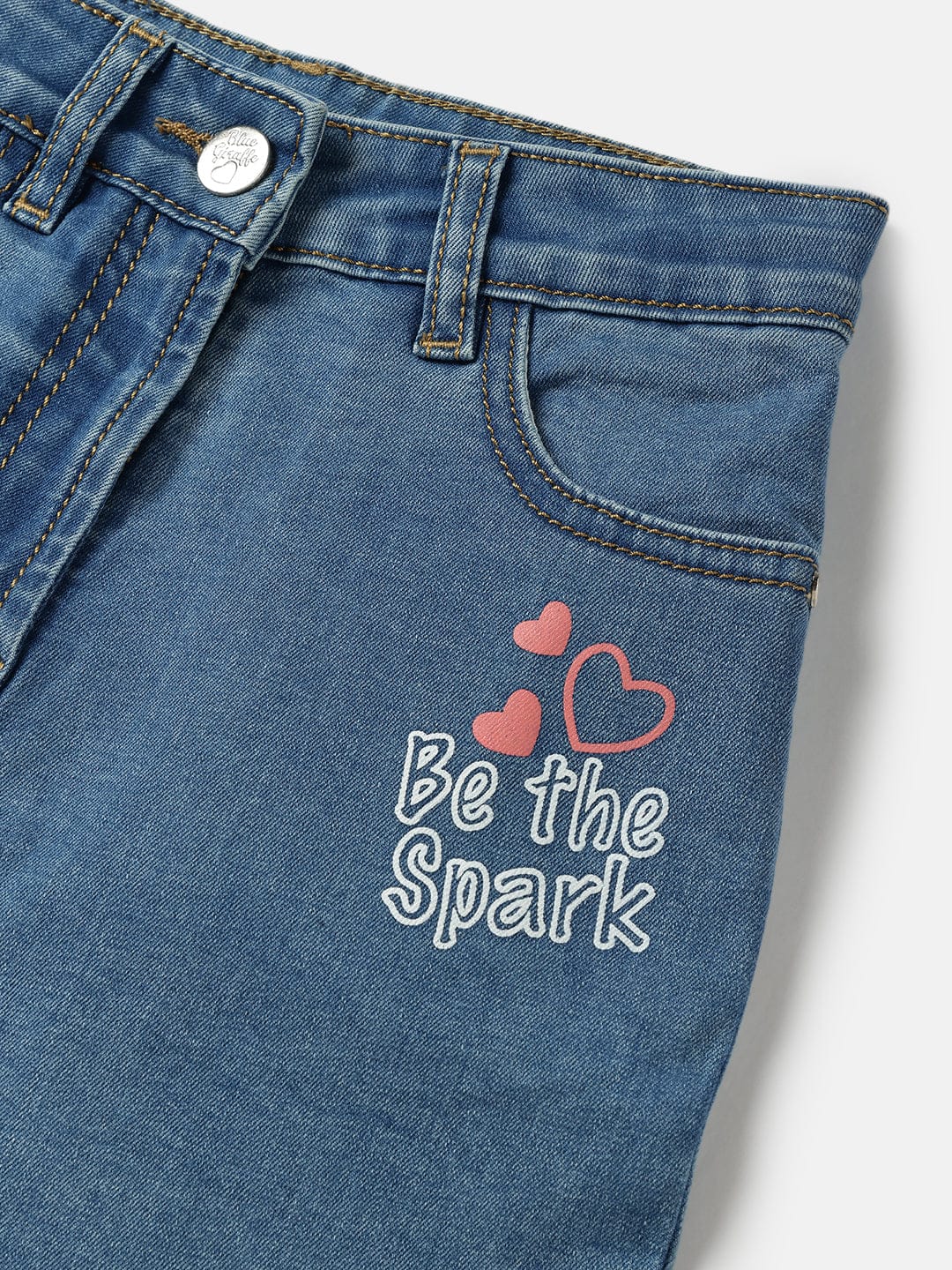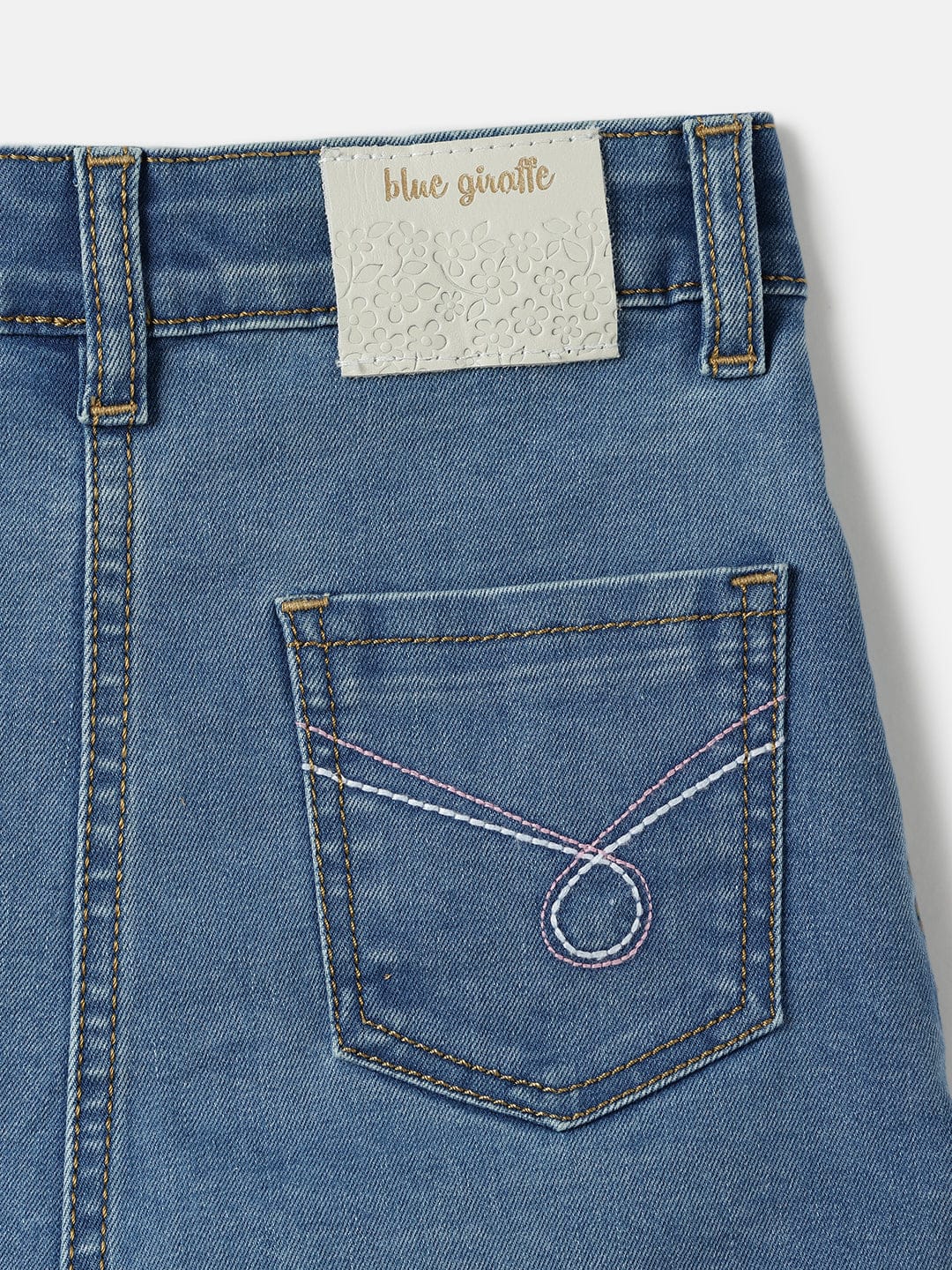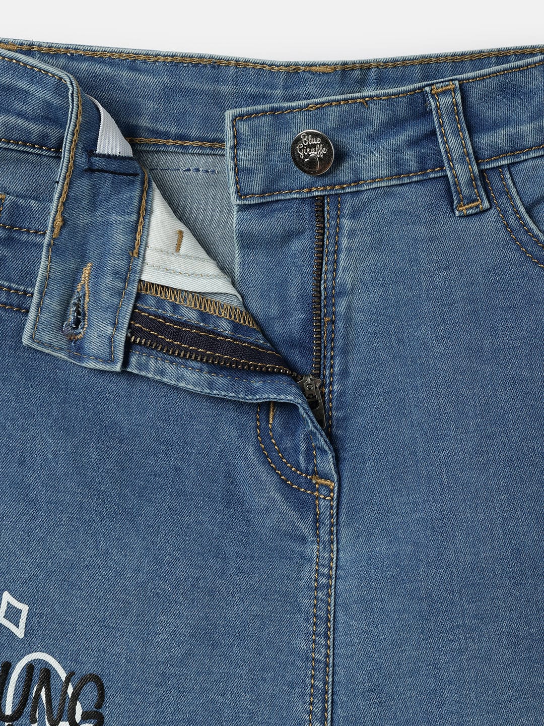 Discover the perfect blend of style and comfort with our Denim Mini Skirt for girls. Crafted from a premium cotton blend fabric, this skirt offers a regular fit that ensures ease of movement. The mid-rise design provides a flattering silhouette, while the button closure adds a classic touch. Featuring a unique typography pattern, this blue skirt stands out with its stretchable placement print on washed denim, making it both trendy and versatile. Ideal for casual outings or playful adventures, this skirt is a must-have addition to any young fashionista's wardrobe.