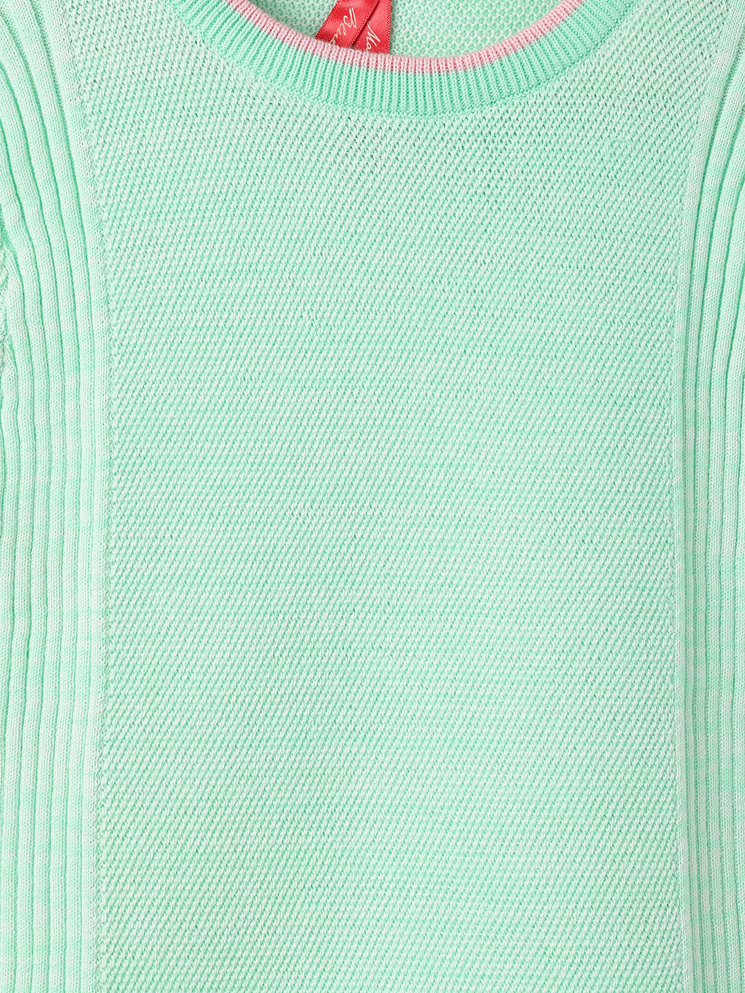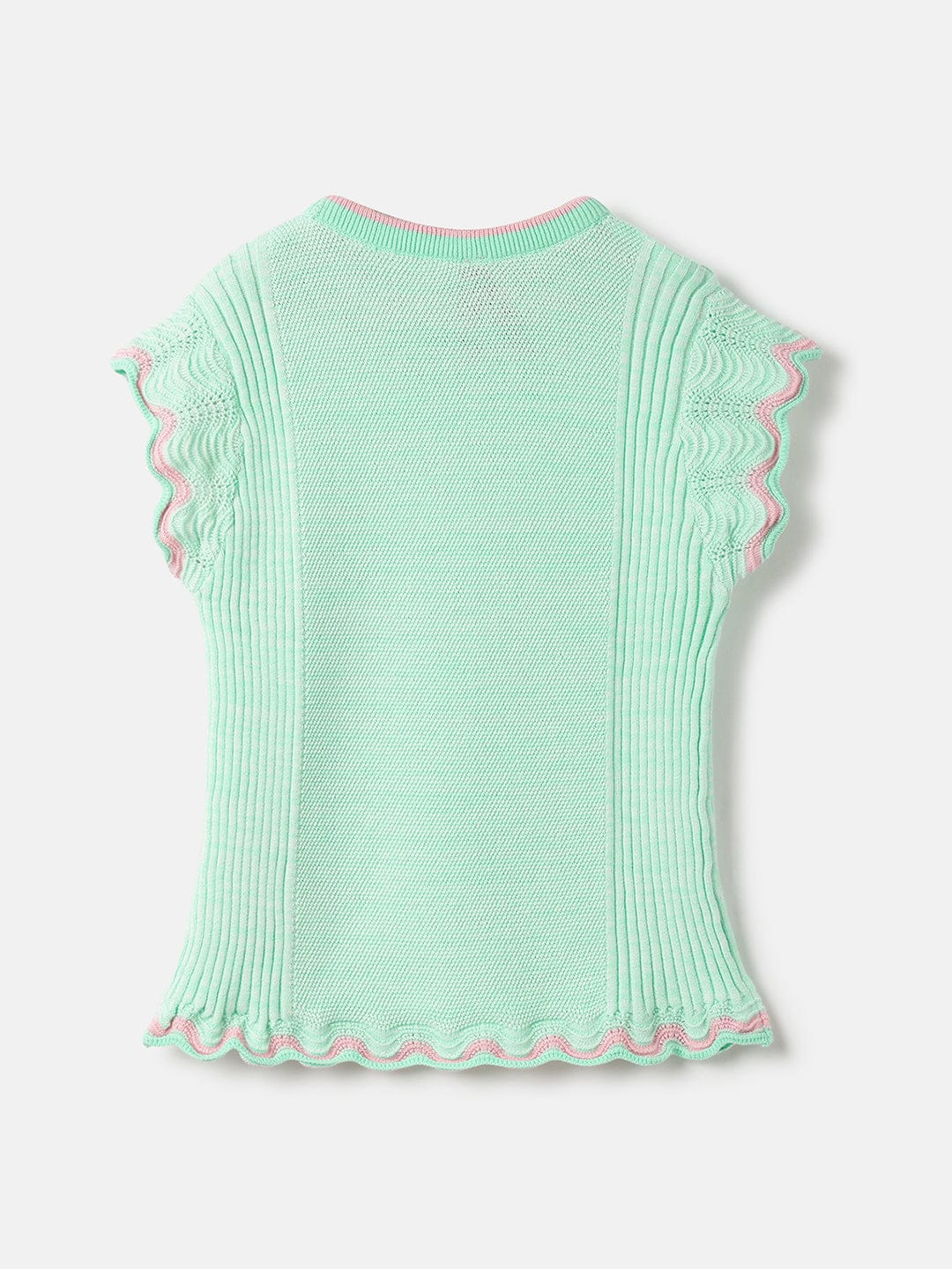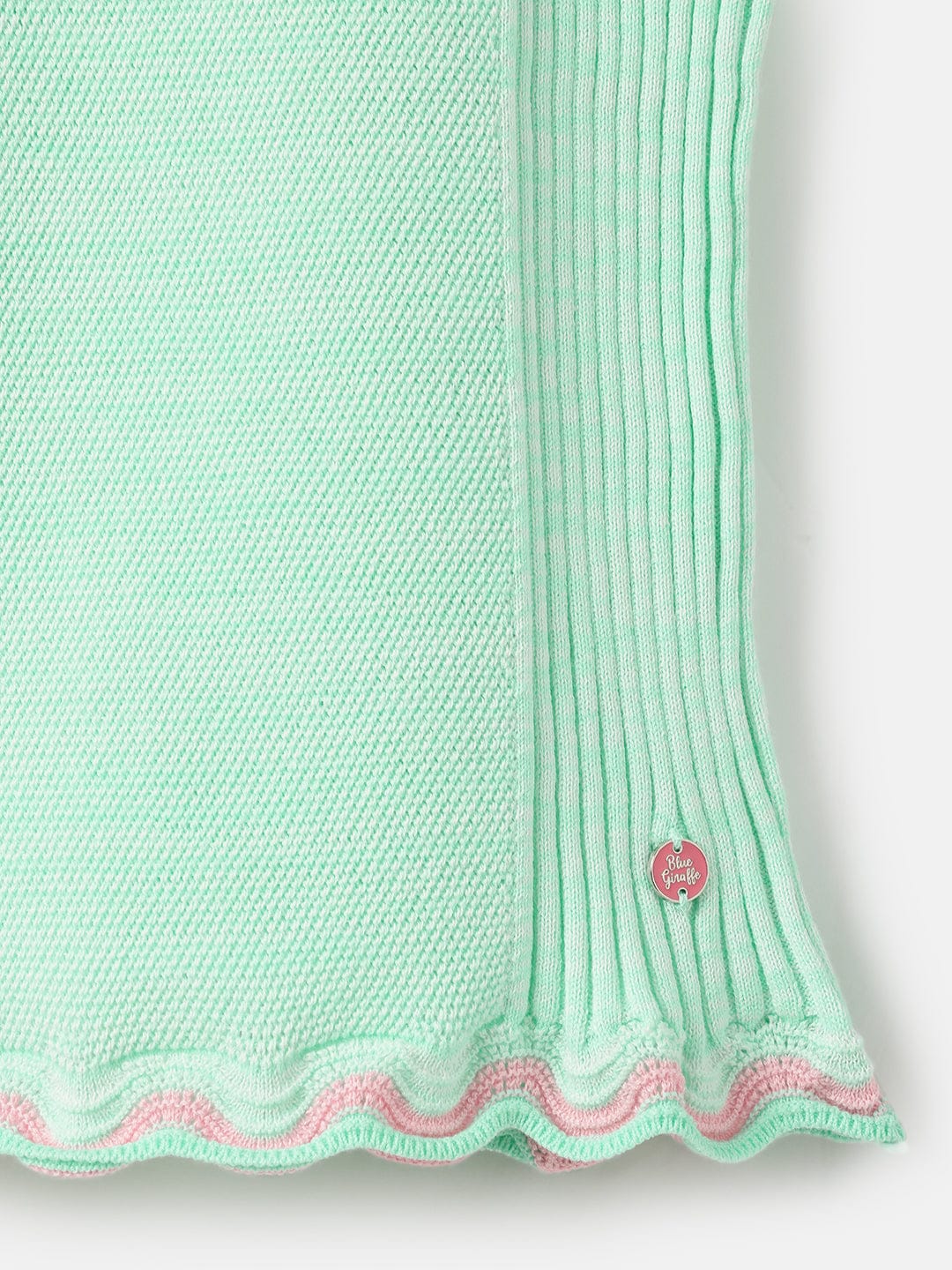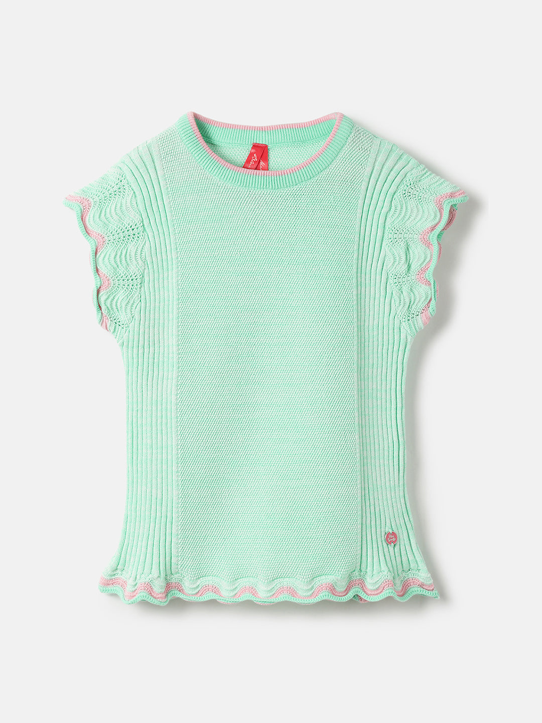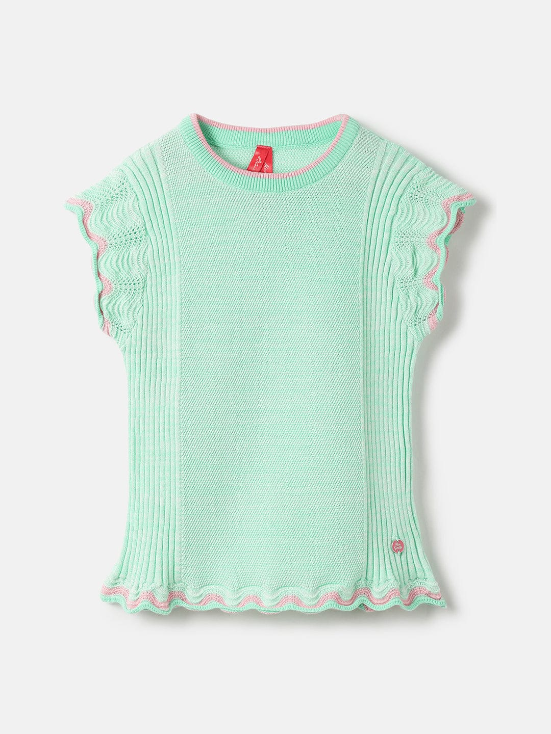 Discover the perfect blend of style and comfort with our green knitted top for girls. Crafted from soft cotton fabric, this top features a regular fit that ensures ease of movement. The vibrant colorful mélange textured flatknit adds a playful touch, while the cap sleeves and round neck provide a classic silhouette. Designed with a pull-on closure, it's easy to wear and perfect for any occasion. The stretchable material offers flexibility, making it ideal for active days or casual outings. Elevate your wardrobe with this versatile piece that combines fashion-forward design with everyday practicality.