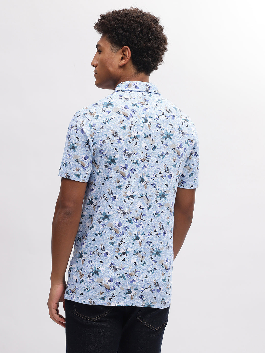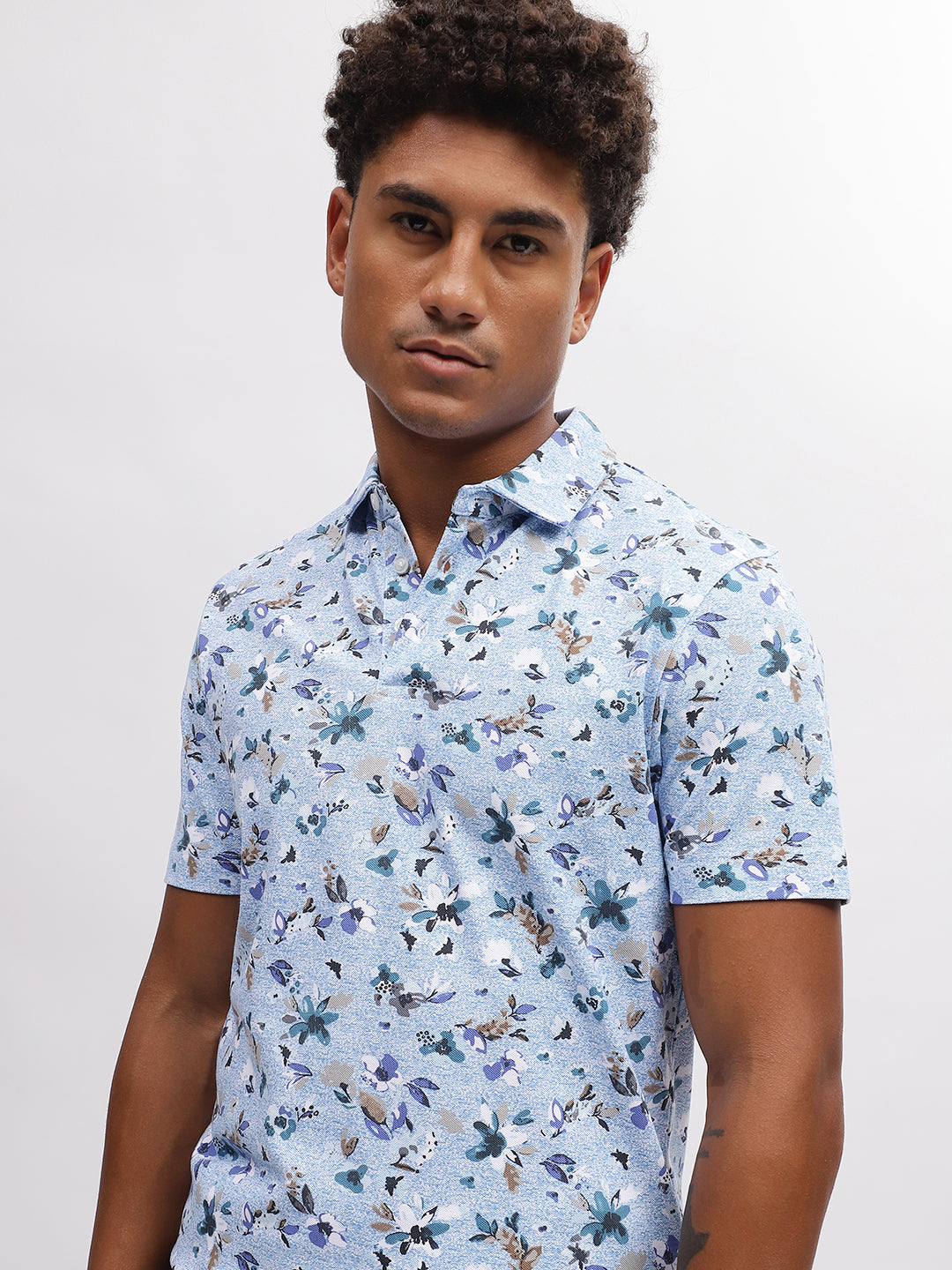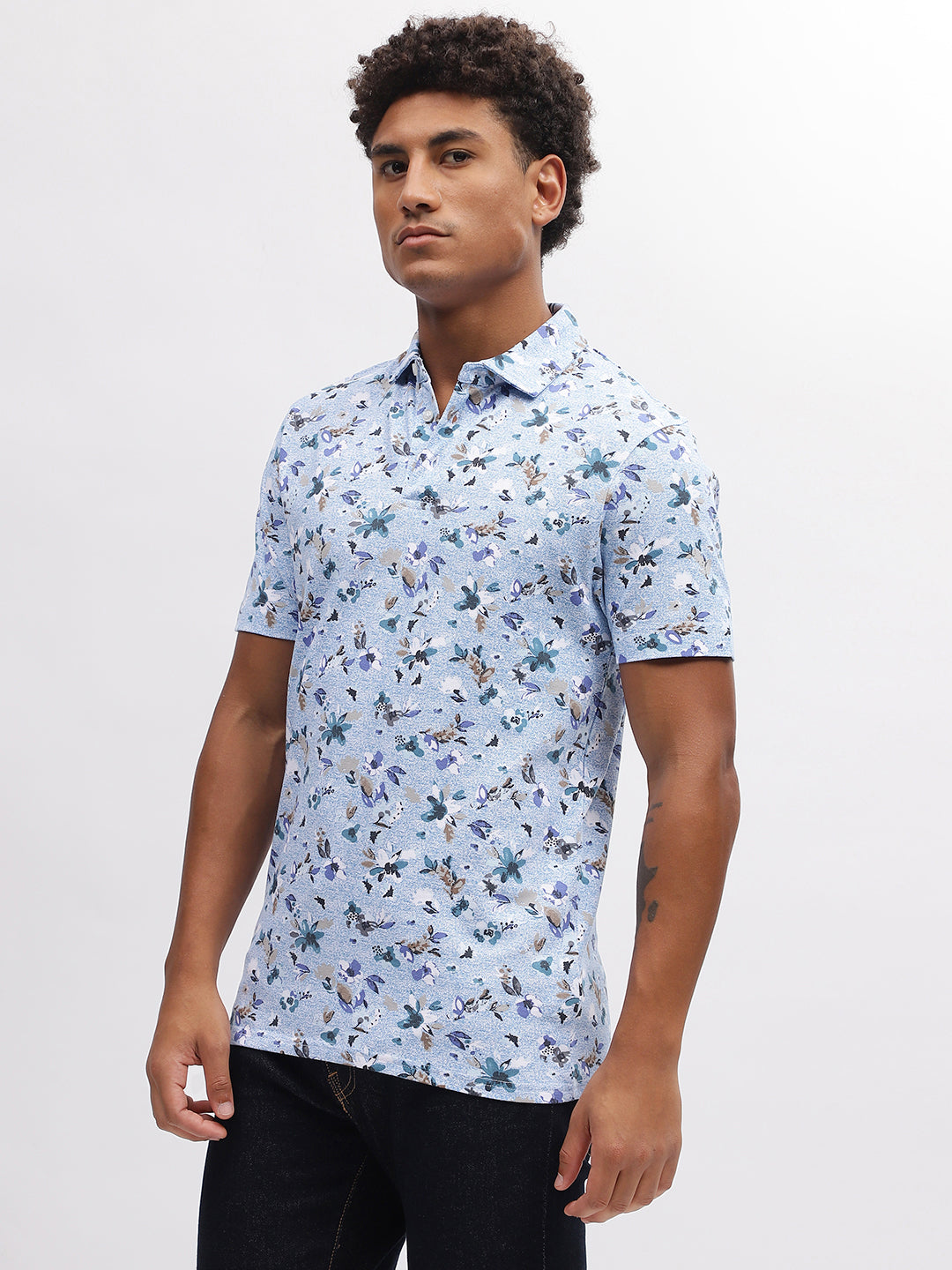 Men Blue Printed Polo Collar Short Sleeves Tshirt